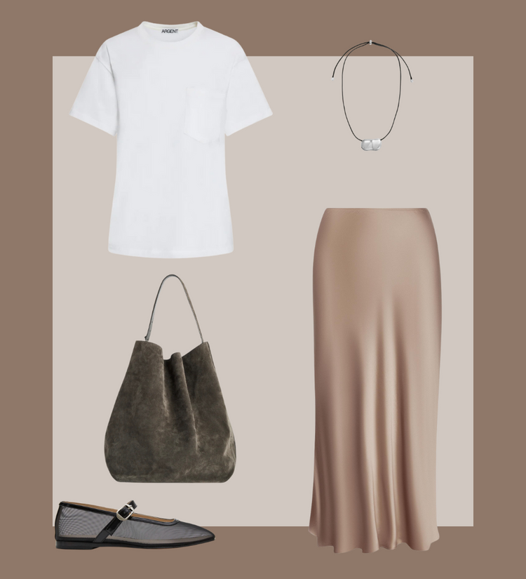 When you're pressed for time, the best choice is to combine texture with something simple. Our Pocket Tee in cotton—a classic—provides the perfect counterbalance to our silky Bias Midi Skirt and showcases sophisticated elegance. For an added touch, consider styling with a suede tote, mesh flats, and minimal accessories.