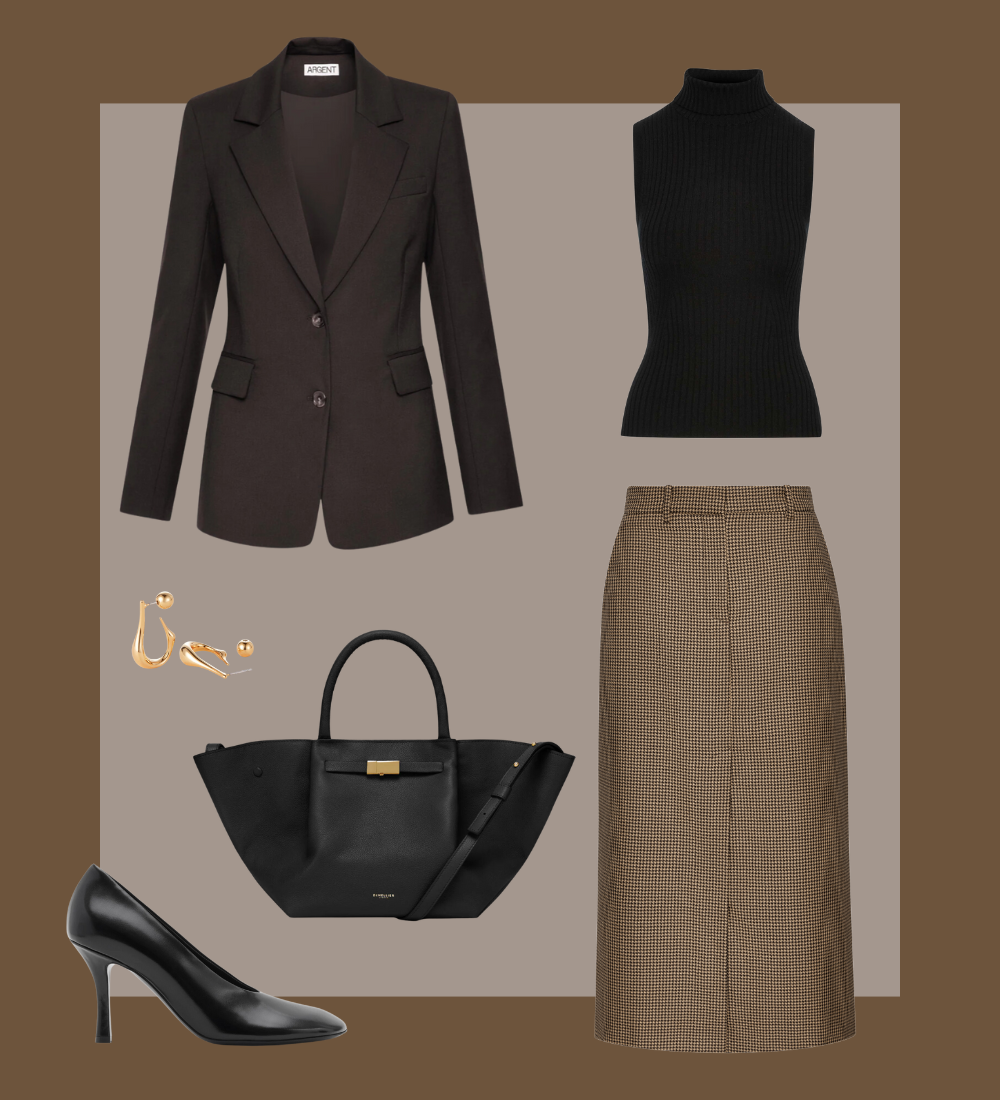 Texture and print are frequently used interchangeably, because they both give dimension to an outfit. Leverage this and mimic the effect of mixed textures through the use of prints. For instance, pair our Tailored Skirt in Plaid Houndstooth with our wool turtleneck and Two Button Blazer. Complete the ensemble with a stylish pair of pumps, a croc handbag, and an unconventional pair of hoops.