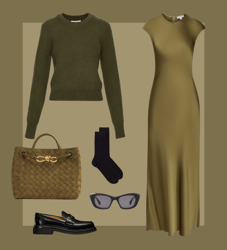 Ground your outfit in a specific color for foolproof texture mixing. Opt for pieces within the same color family and enhance your ensemble with varied textures. Our Bias Dress pairs wonderfully with any knit—particularly our favorite, the Shrunken Crewneck—layered on top or draped over the shoulders (just like editors do it). Continue the theme by adding textured and monochromatic accessories.