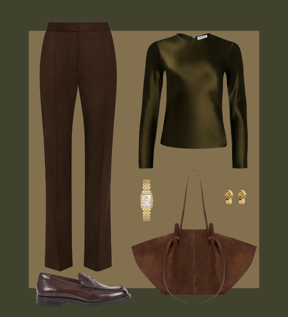 Styling the color brown is as simple as substituting in wherever you’d otherwise wear black. Pair our Straight Pintuck Trouser with basil Longsleeve Bias Top for a blend of deep tones that complement each other beautifully. Complete the look with loafers, a tote, and timeless gold jewelry that reinforce your new favorite neutral.