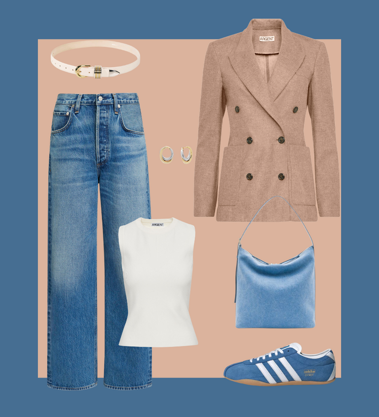 Styled with Shashi earrings, a Dehanche belt, an APC handbag, and Adidas sneakers.