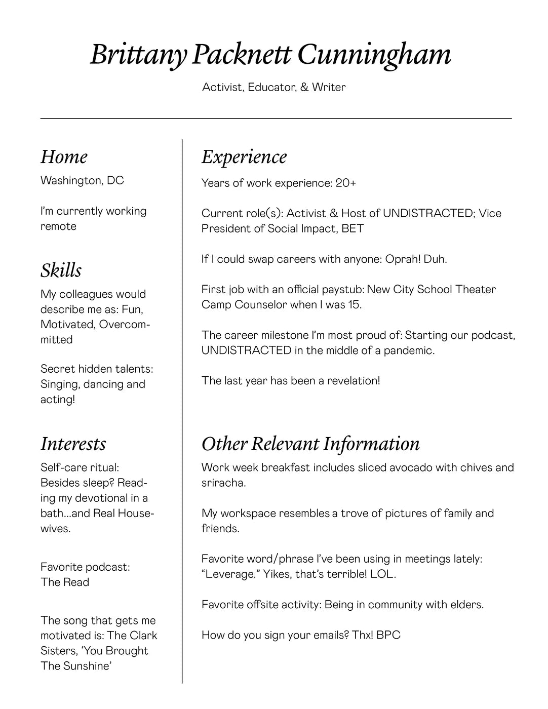 Activist, educator, writer, and podcaster, Brittany Packnett Cunningham—BPC, if you’re friendly—is coincidentally also learning to practice the art of rest. She may be overcommitted, but she knows what she’s capable of and “leverages” (a buzzword that she just can't quit) every ounce of it for good.