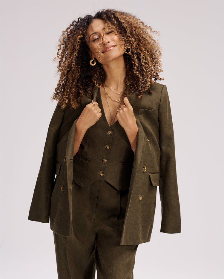 Becoming a mom has shifted how I move through the world in every way, including how I dress. I am all about comfort, convenience, and ease now. I love high-impact looks with low effort. Even getting ready for this morning’s Zoom, I had no time. My baby was about to wake up. I had a lot going on. So I threw on a simple black turtleneck that will do the job. I added some gold earrings, pulled my hair into a low bun, I have no makeup on, and I feel totally fine about that. I still feel chic—even if it's not all perfect. I think that having a baby strips away anything that’s not essential. For me, it has been such an empowering experience. Just seeing and experiencing what my body can do has made me feel more confident in my body across the board. I'm like, “Who cares if I'm not wearing makeup! Did you know I had a nine-pound baby unmedicated on my bedroom floor? Did you know I'm a superhero?”