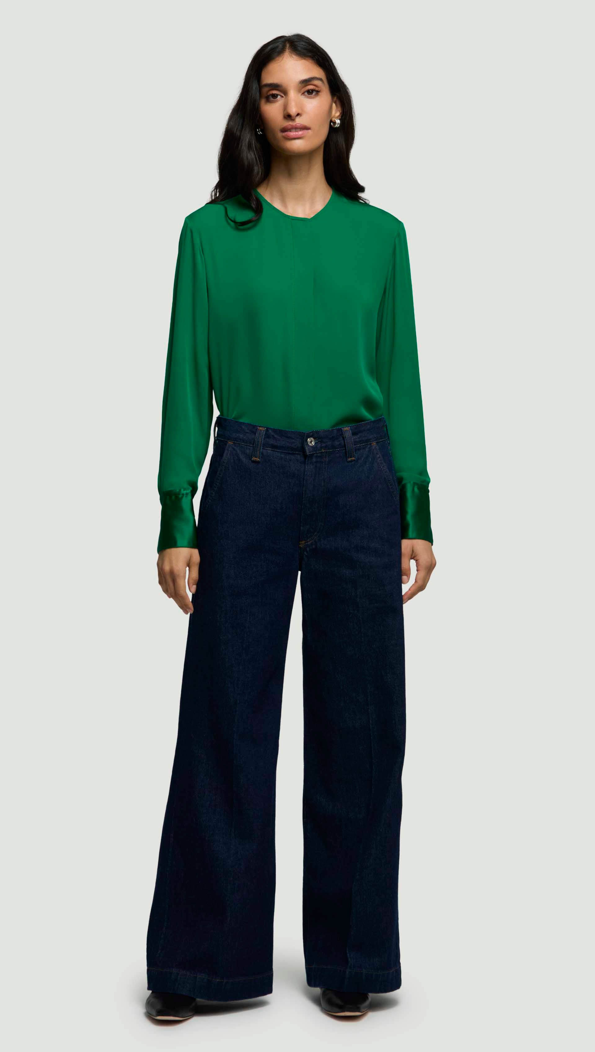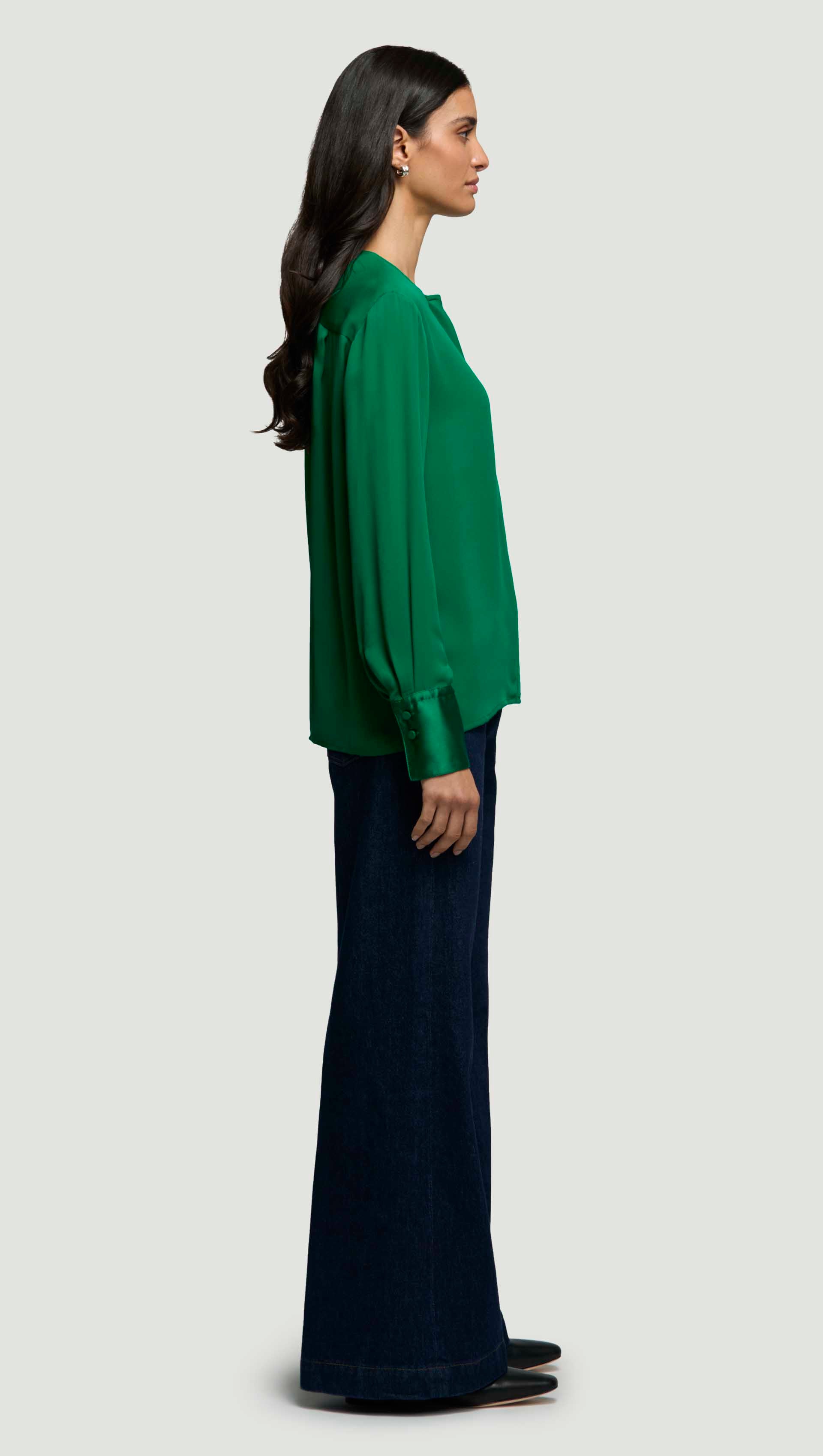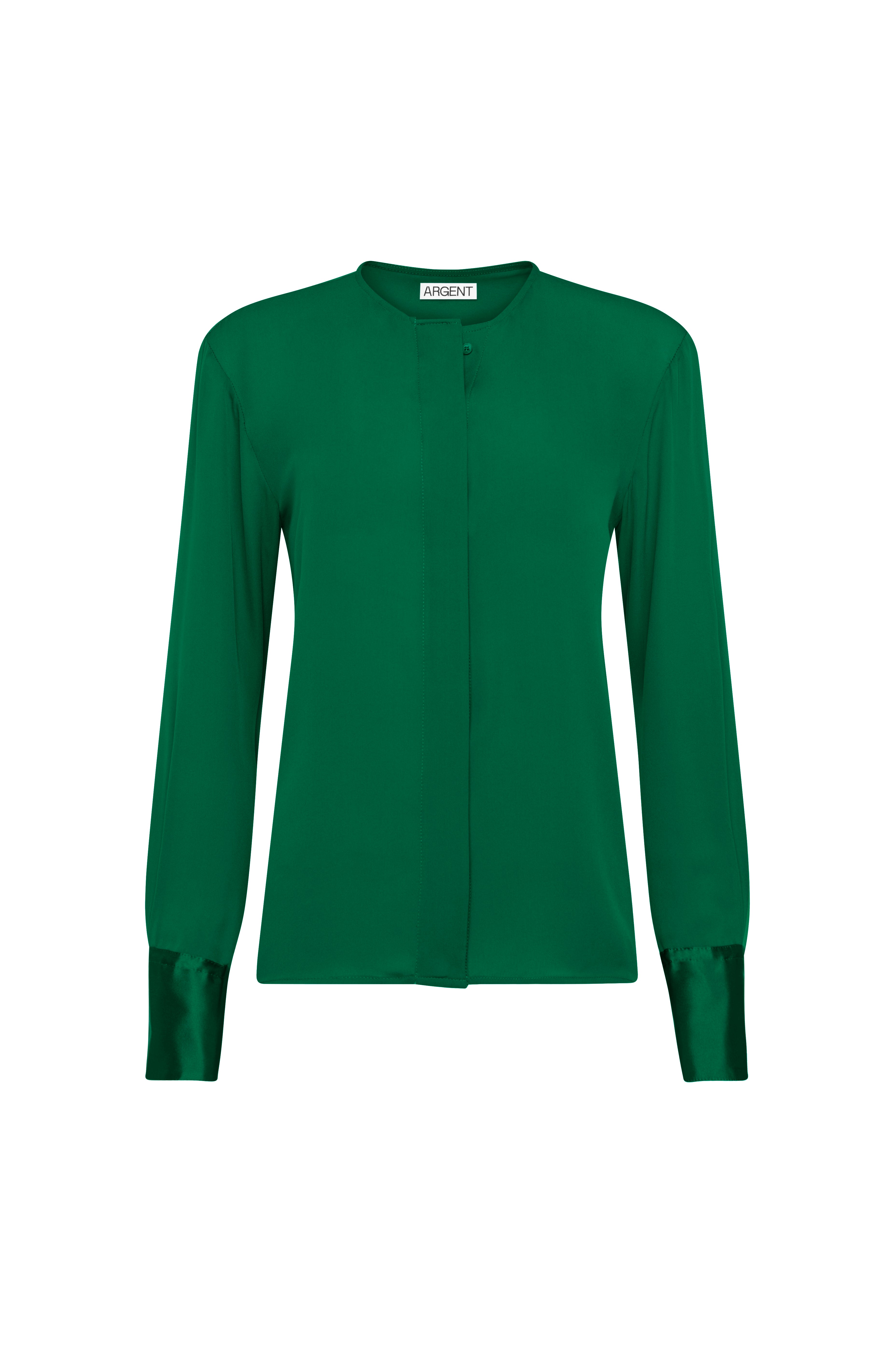 Elevate your look with this Collarless Blouse—designed for effortless sophistication. With its sleek hidden placket, sculptural sleeves, and striking color, every detail is intentional. Style it with denim for casual polish or pair it with the matching trouser for a bold, pulled-together statement.