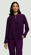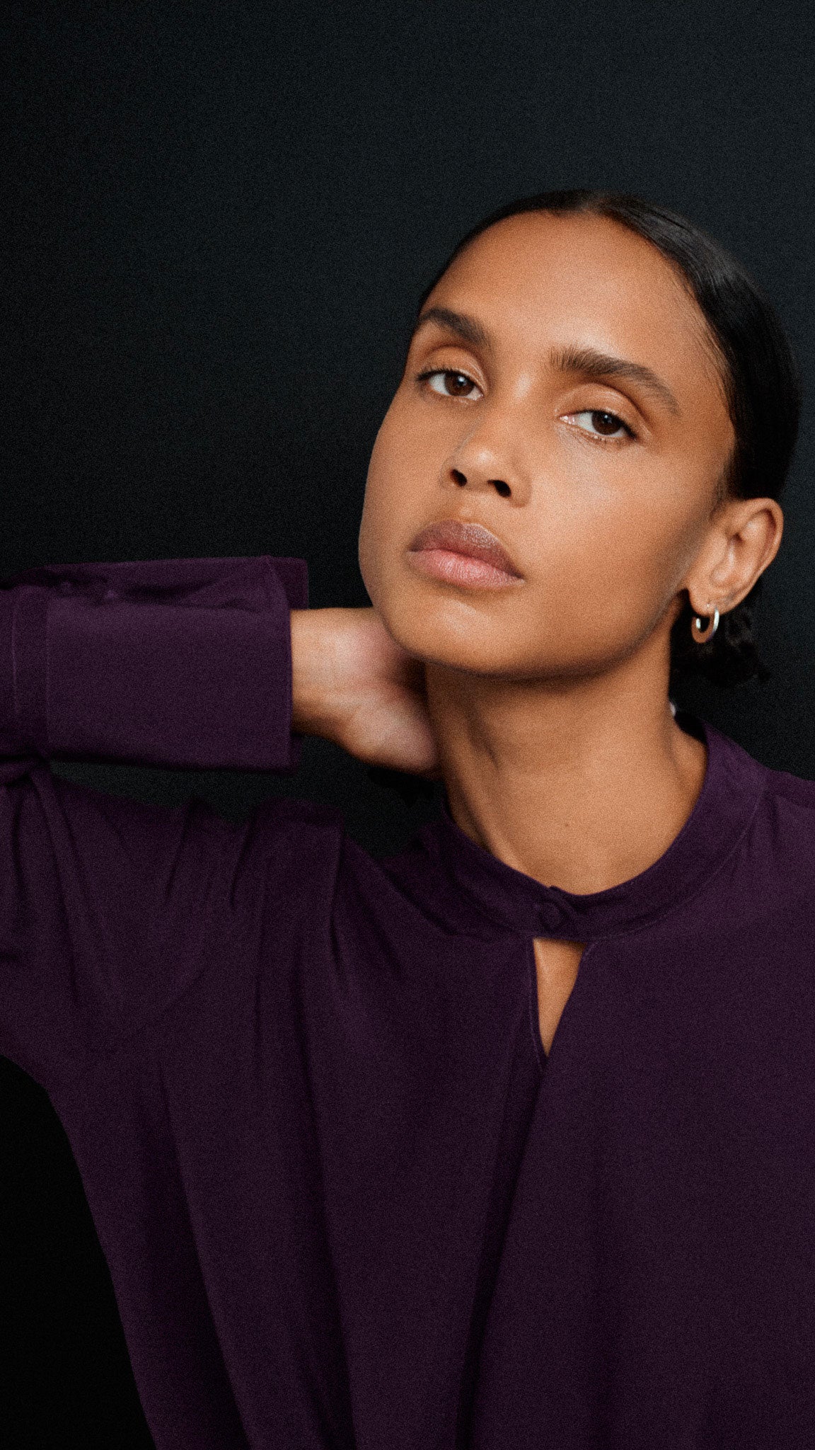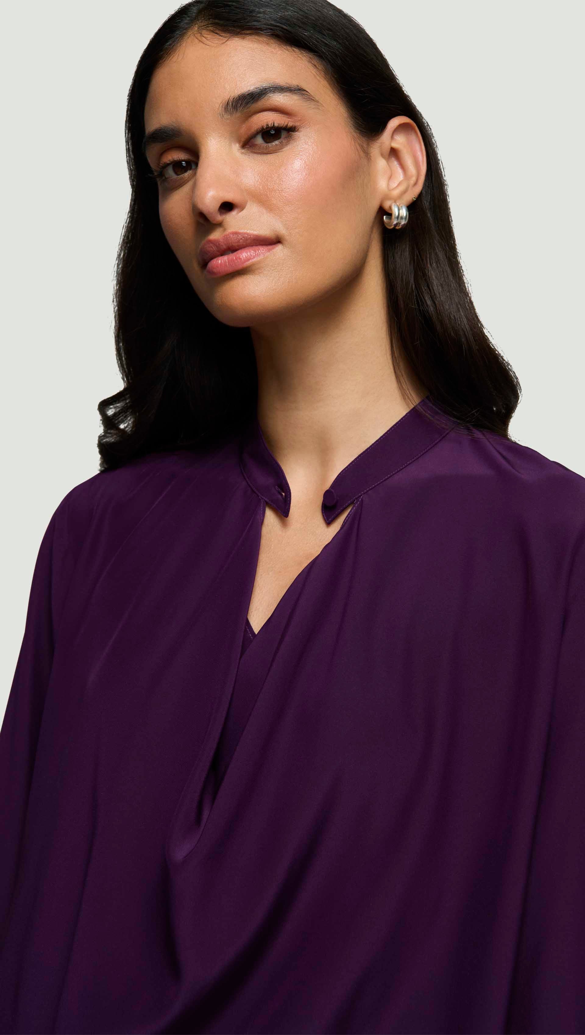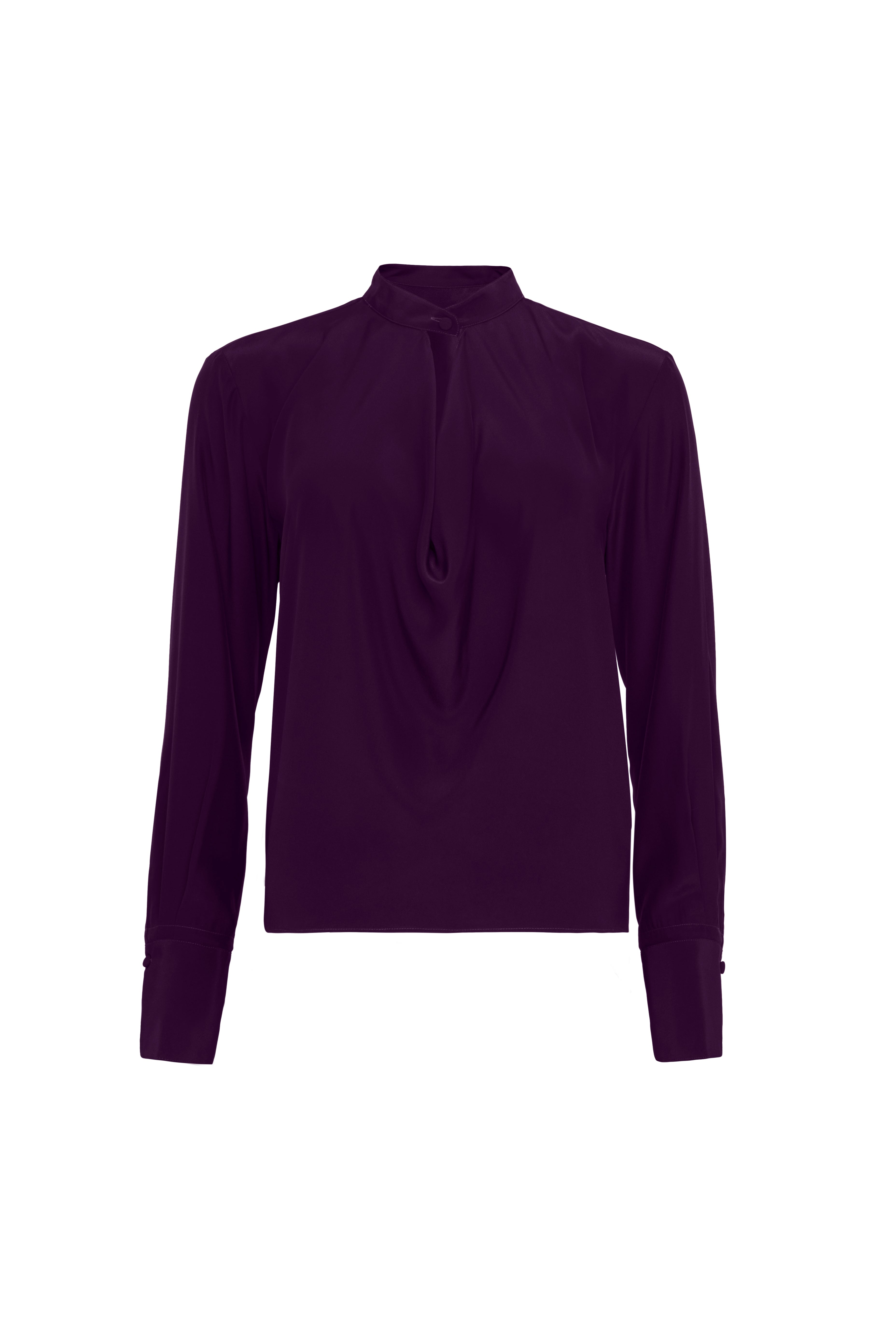 With its elegant draping, this luxurious silk charmeuse blouse offers timeless appeal. The versatile button-up closure allows you to opt for an open neckline or a stylish cowl-neck silhouette. An essential for workdays or nights out, this blouse delivers confidence, sophistication, and flexibility in spades.