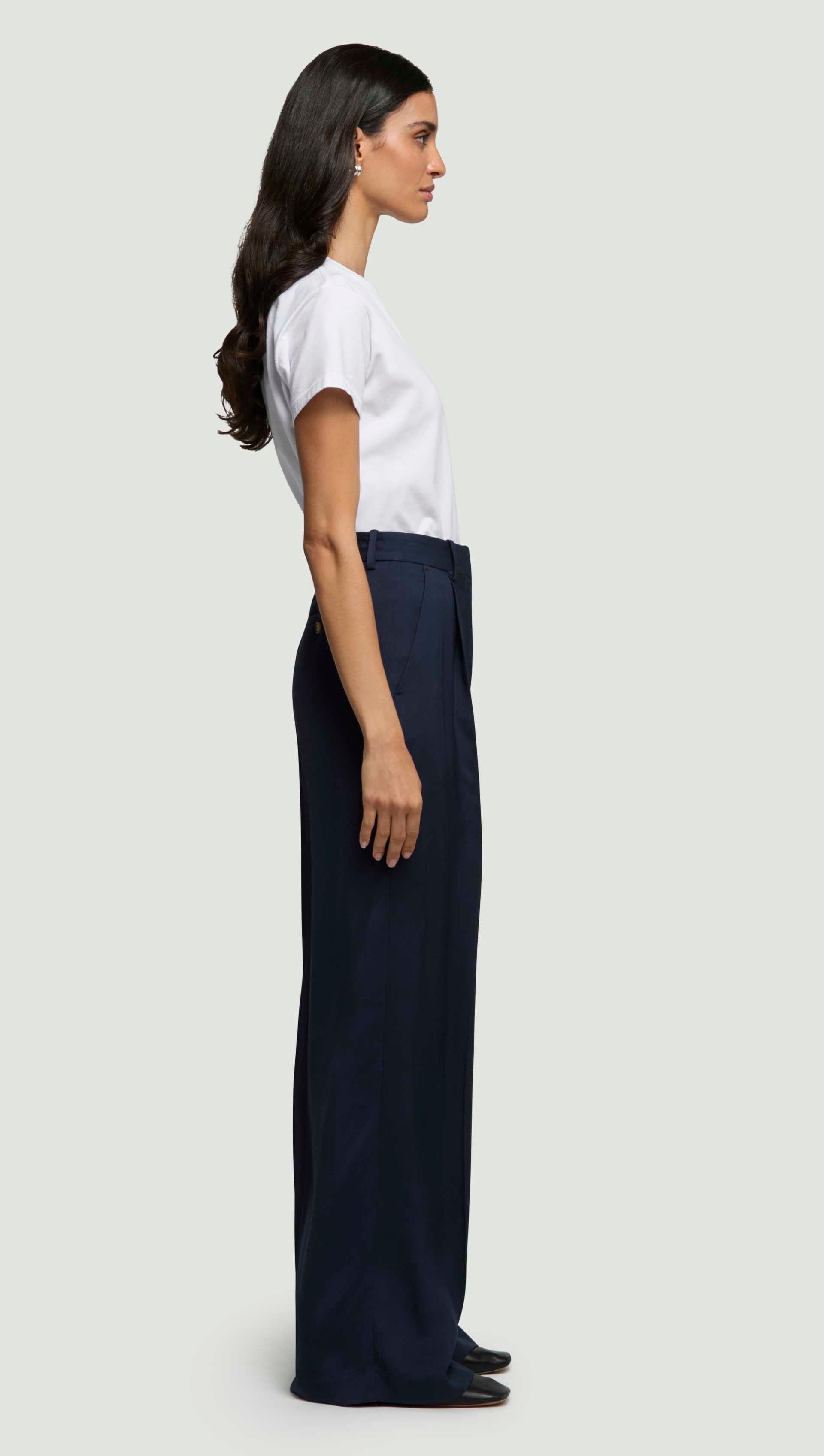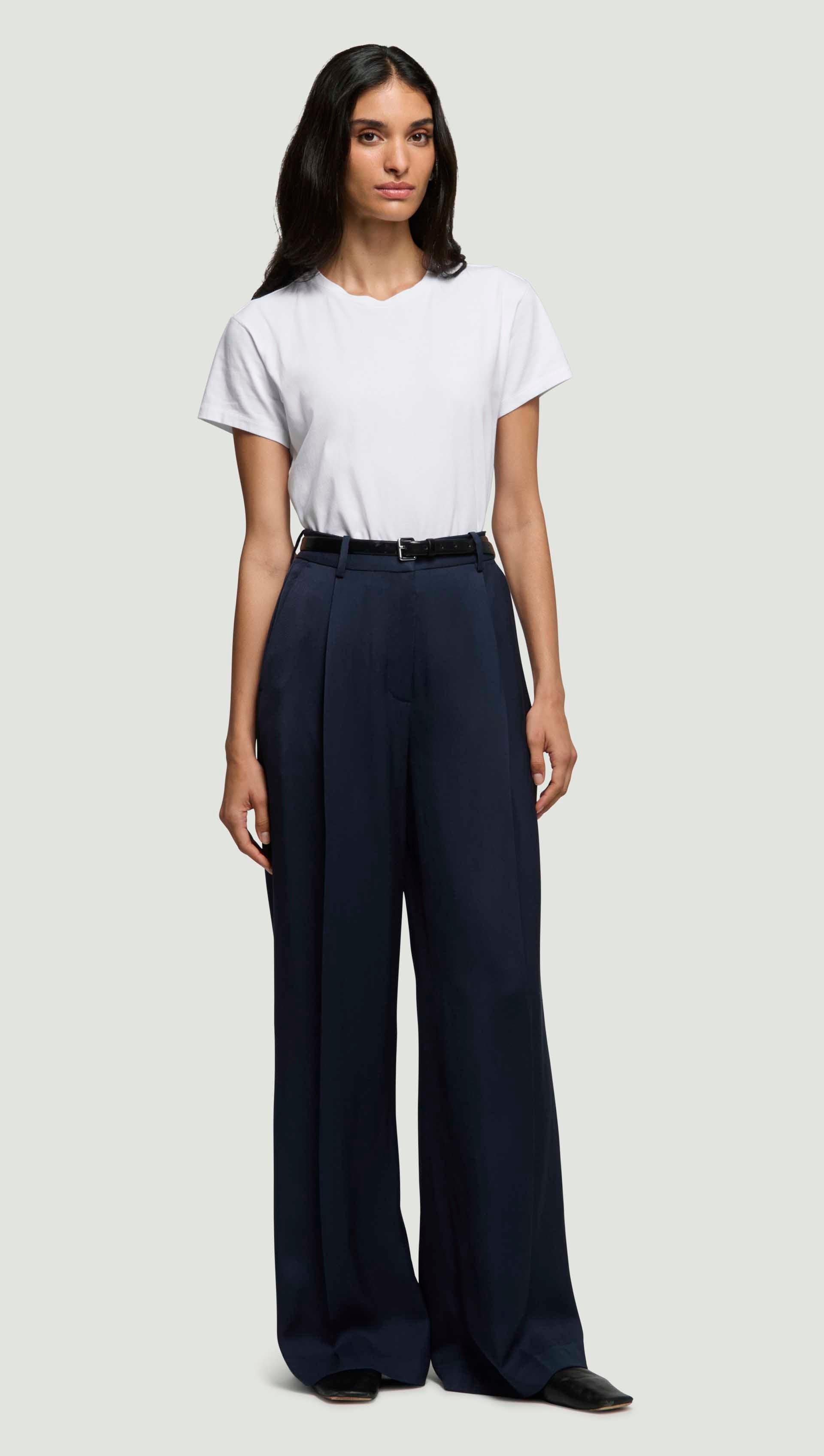 Our slouchy Single Pleat Trouser is a timeless piece that finds balance in touting both a wide leg and a slim fit. The pant borrows from traditional suiting with a curtained waistband — which sits at the natural waistline for a flattering appearance — alongside pleated detailing.