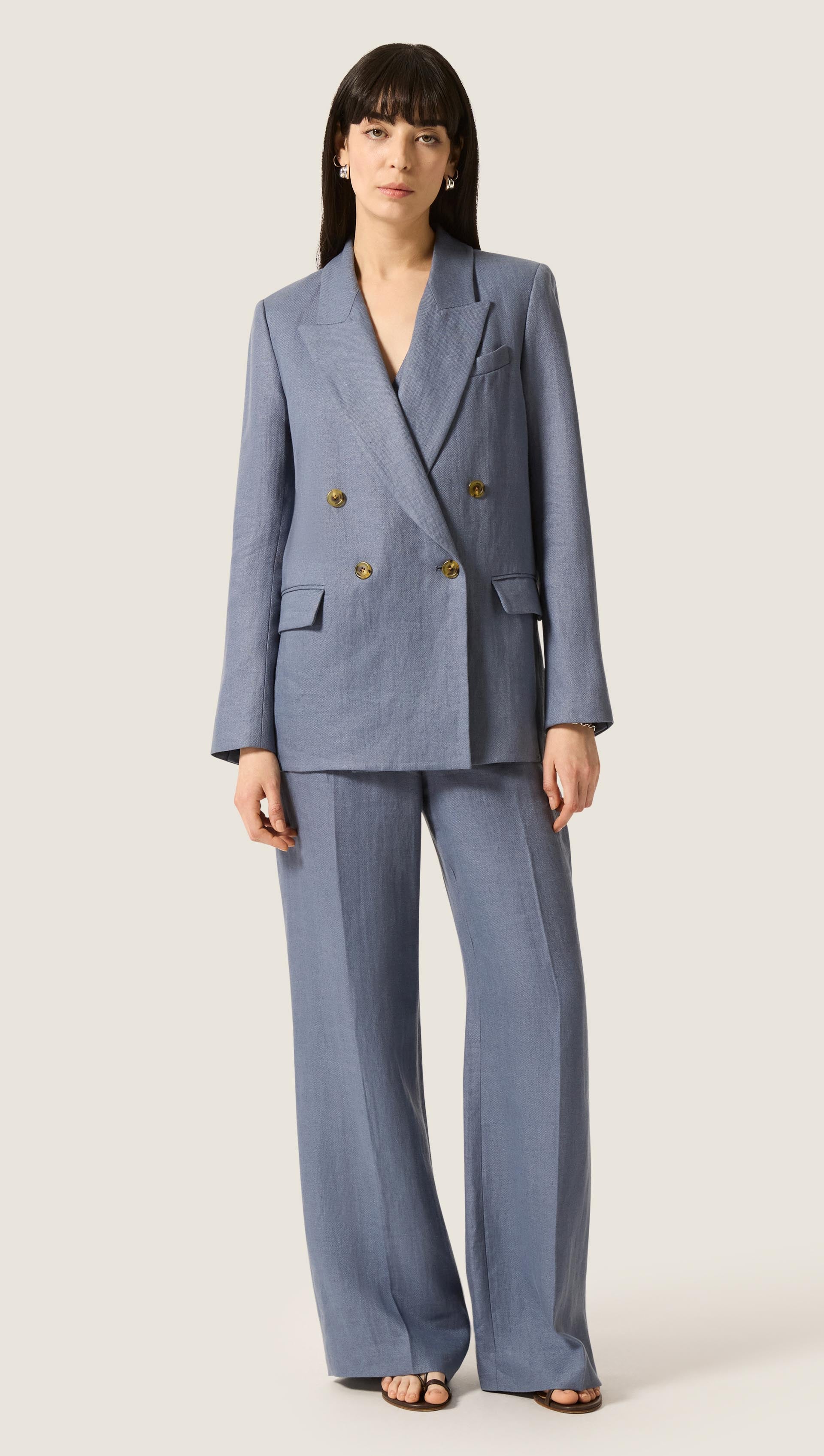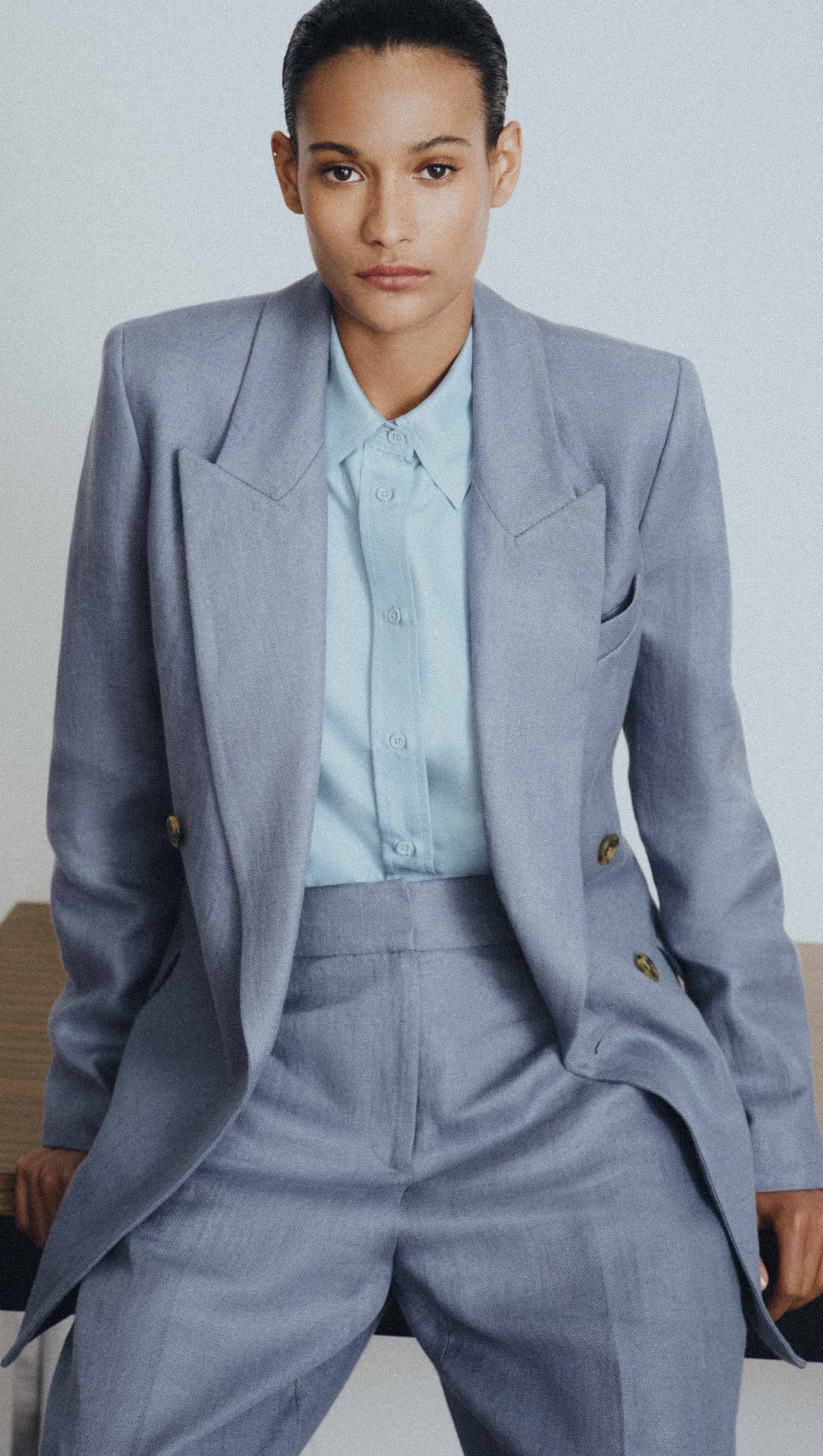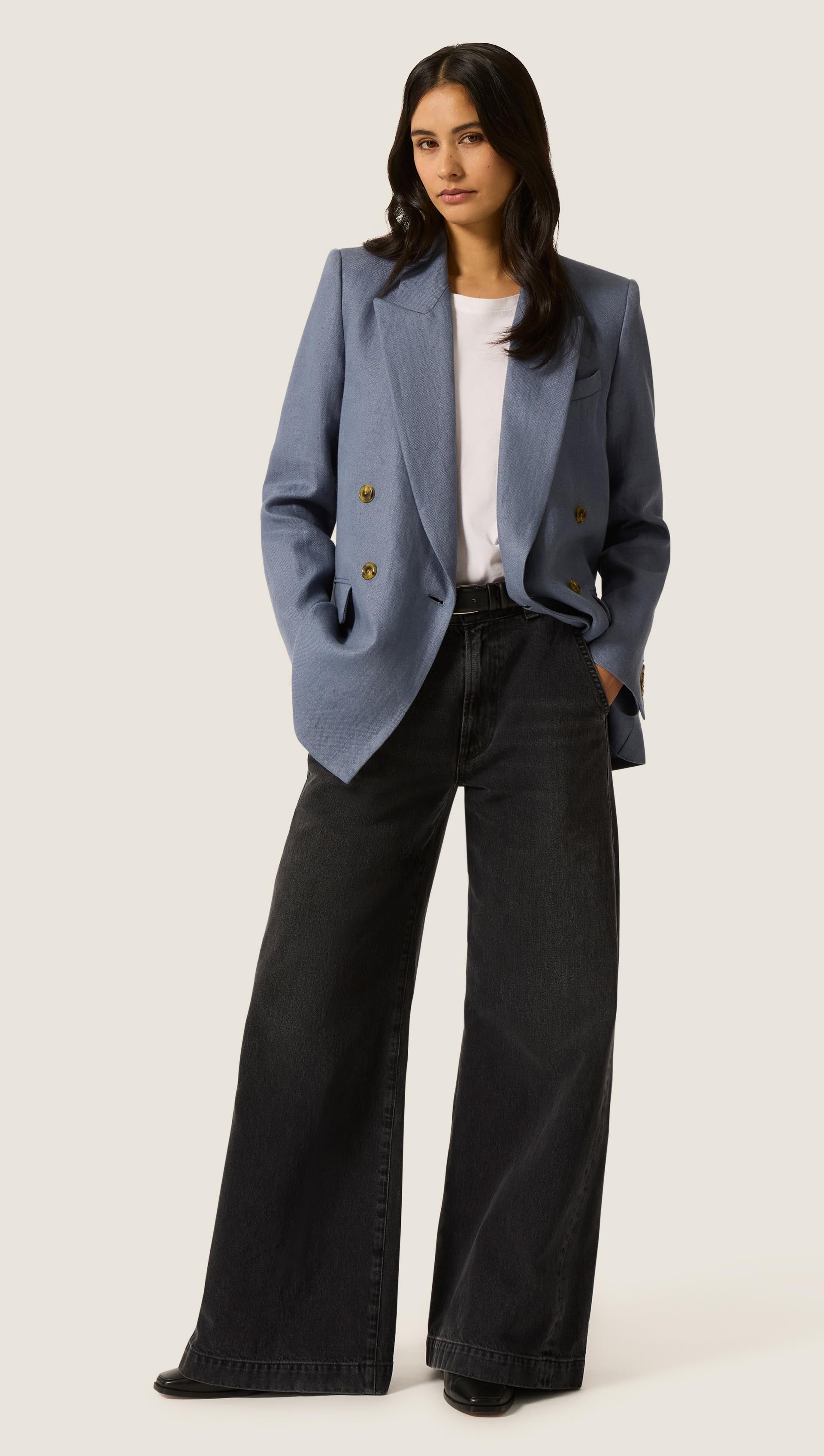 The Peak Lapel Blazer in seasonless wool will take you from fall to spring and back, no matter the weather. Design highlights include the aforementioned peak label, an easy double-breasted closure, slim fitting shoulders, a straight and loose body for a very comfortable fit, as well as interior pockets.