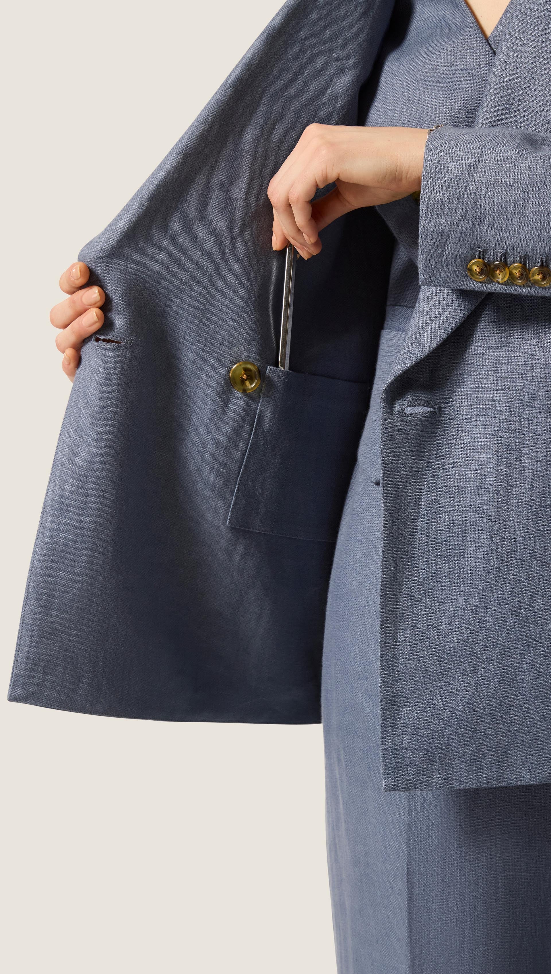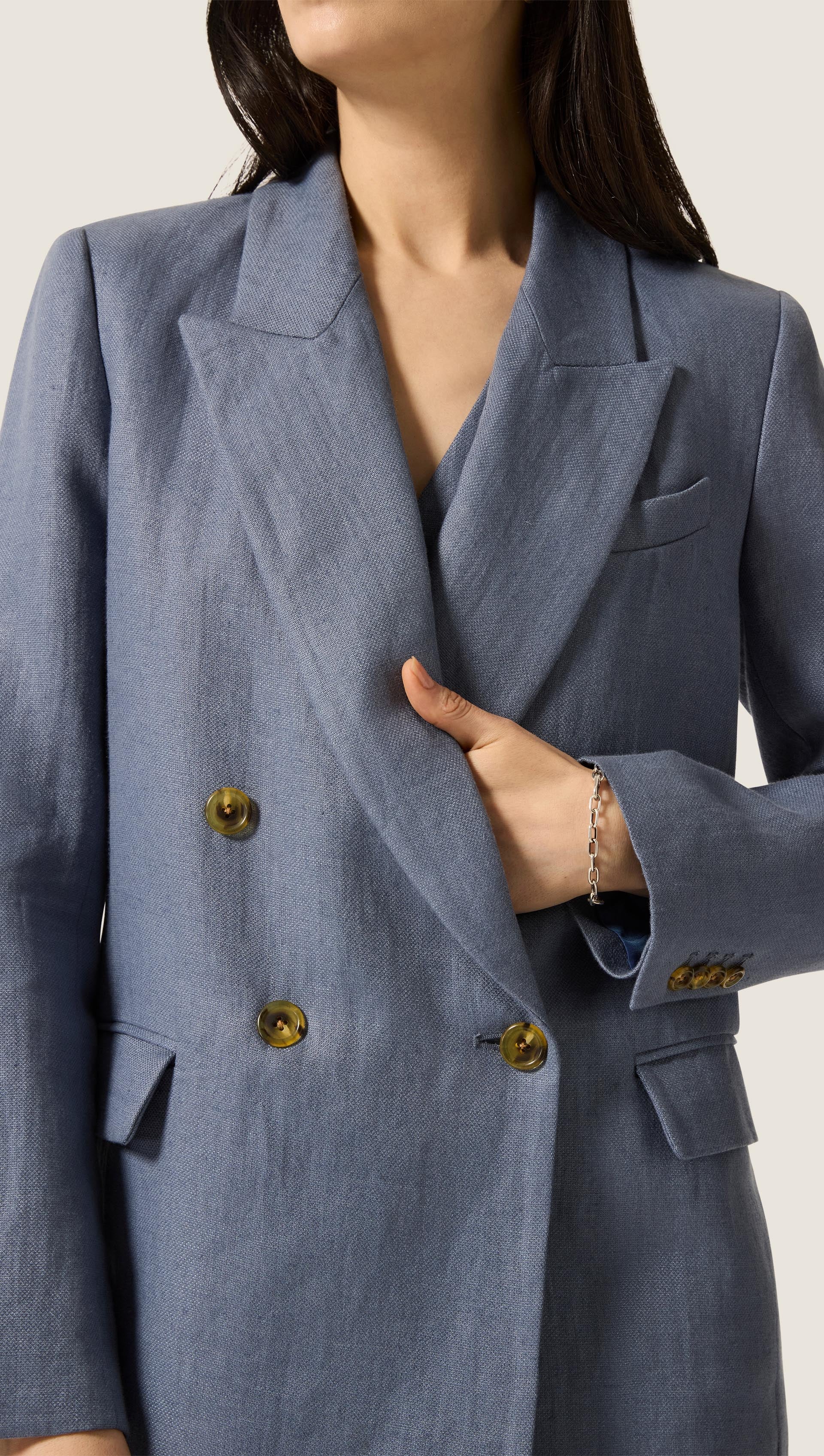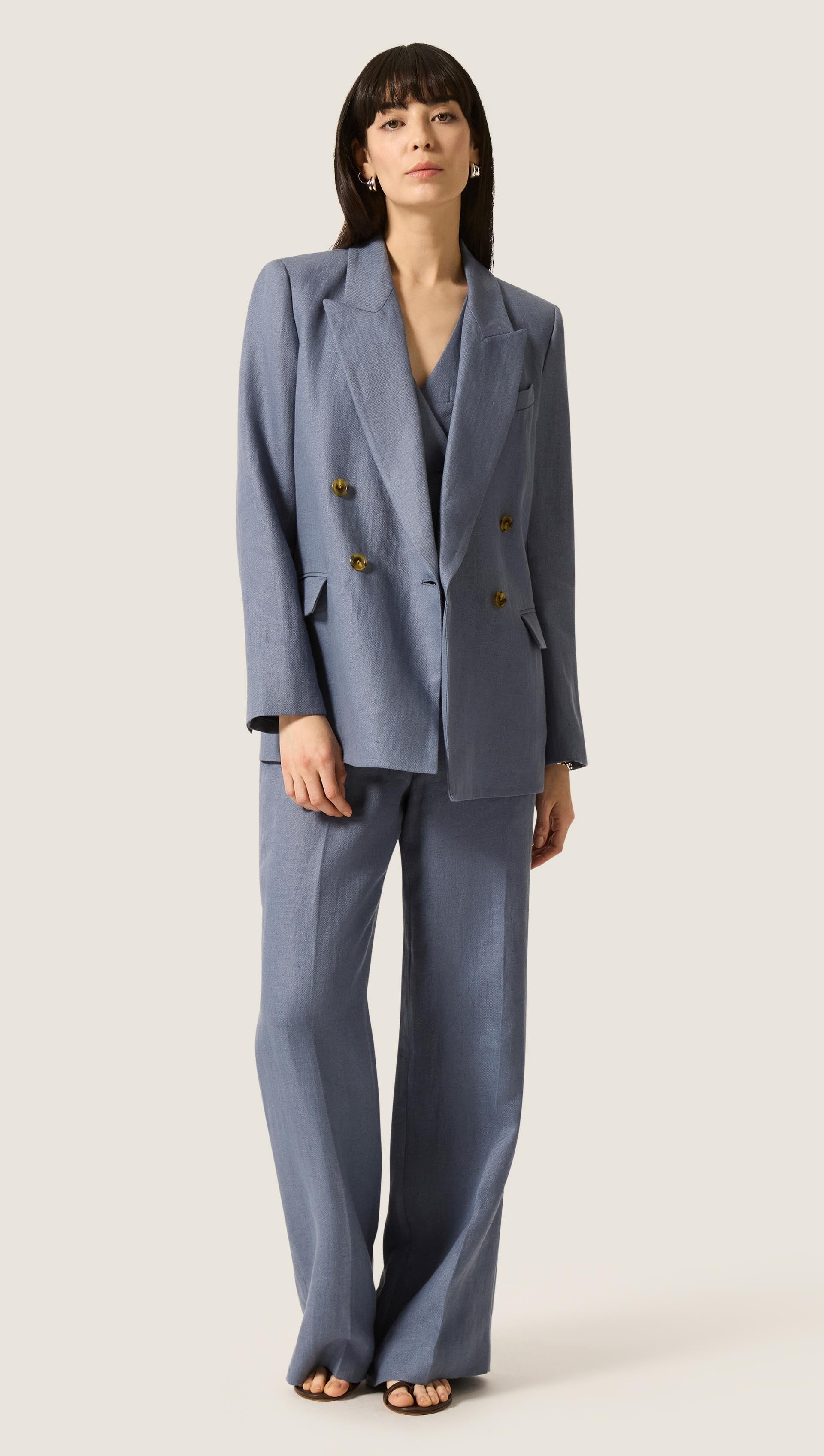 The Peak Lapel Blazer in seasonless wool will take you from fall to spring and back, no matter the weather. Design highlights include the aforementioned peak label, an easy double-breasted closure, slim fitting shoulders, a straight and loose body for a very comfortable fit, as well as interior pockets.