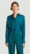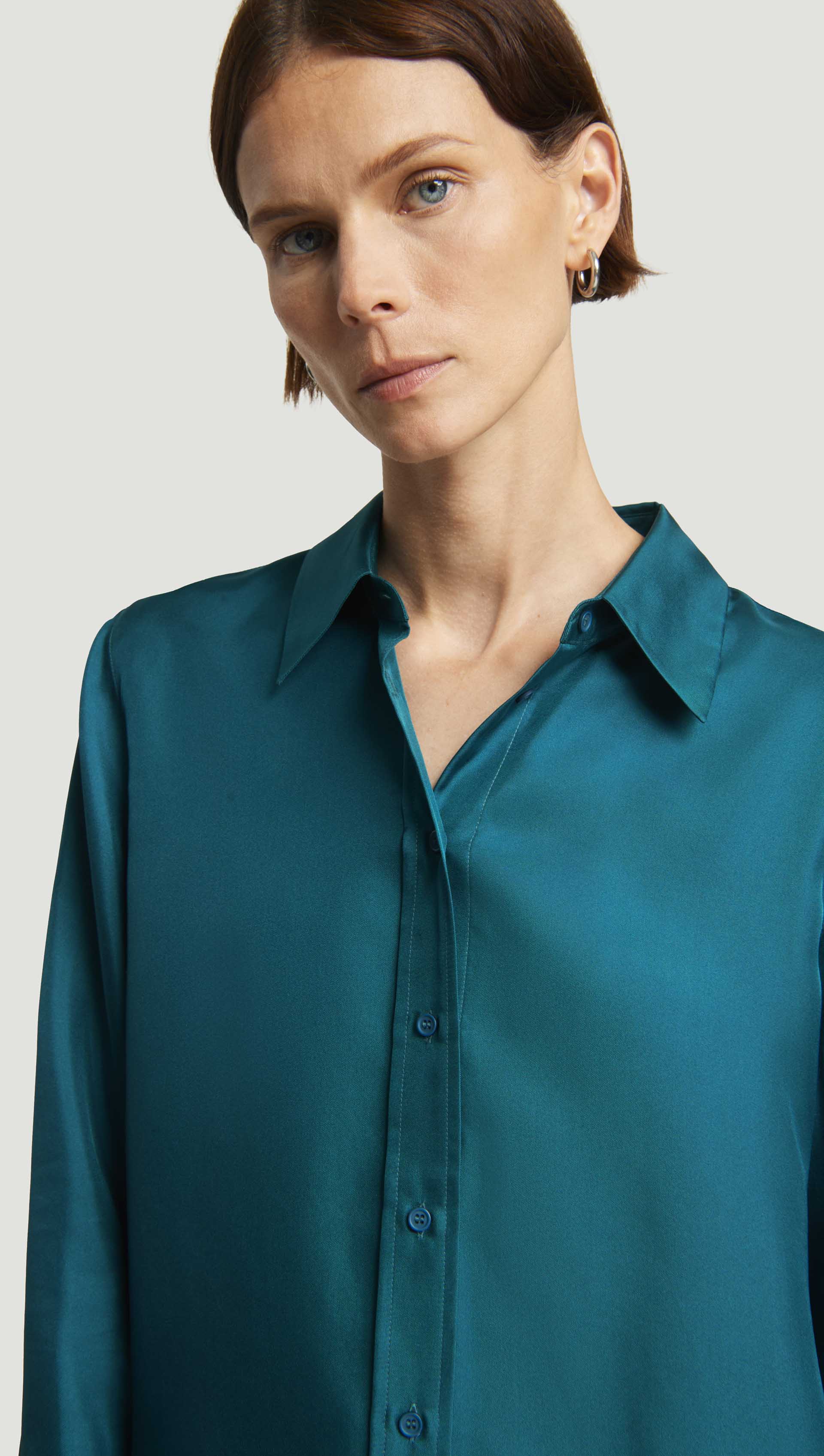 Made of a lightweight silk twill, this slim-fit blouse is bound to be your new go-to. The long-length button-up features lined lapels, a silk charmeuse combo lining the cuffs, and side slit hems. Wear this top partially tucked, fully tucked, or untucked with your favorite pair of trousers.