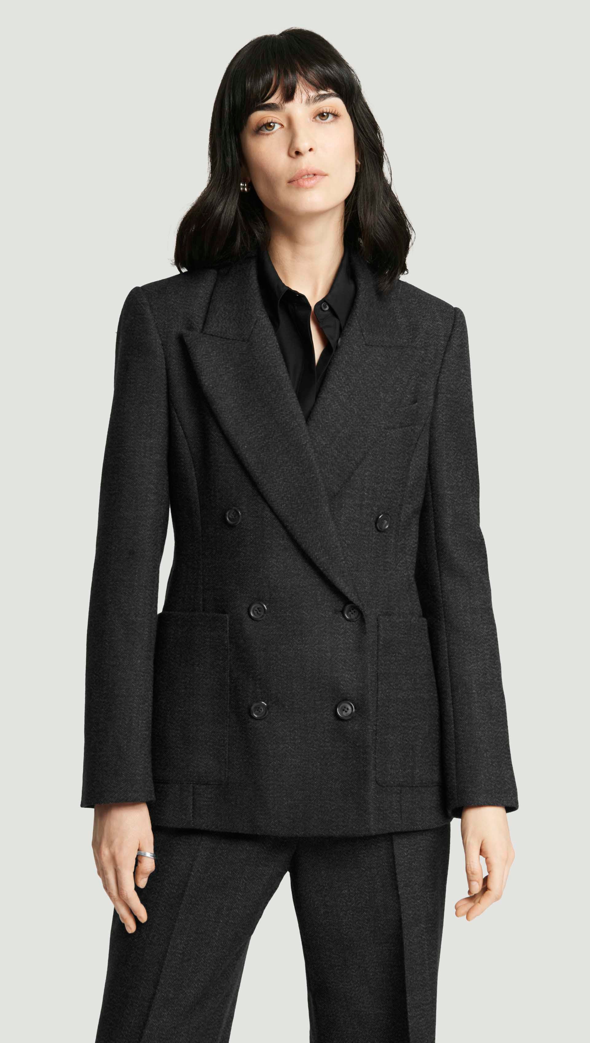 Offering a slightly cinched waist and fitted hourglass shape, this double-breasted blazer is a style statement all its own. Additional details include large exterior patch pockets, interior pockets, and smart cuff sleeves. Finish the ensemble with a classic tee, midi skirt, and heels.