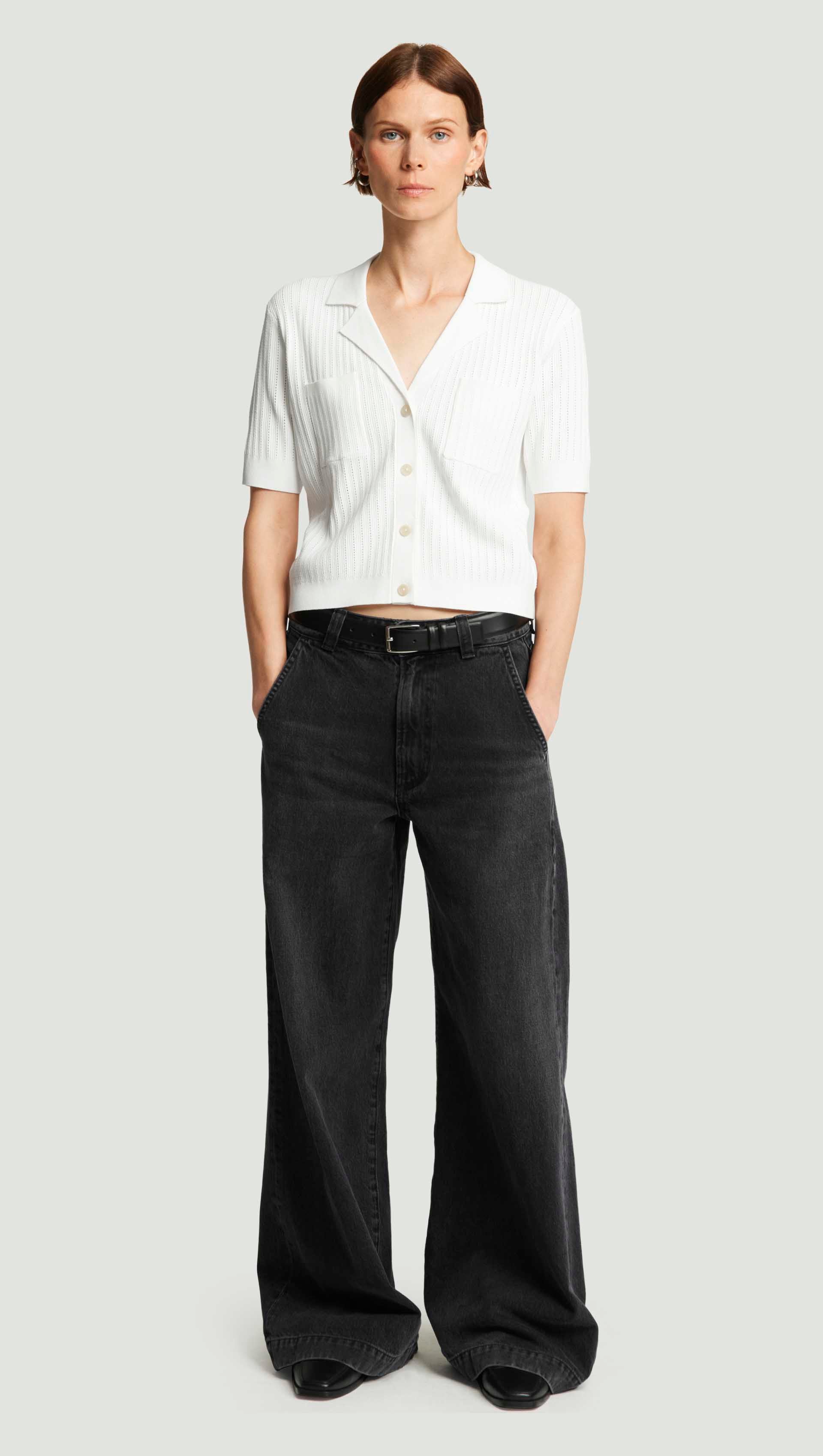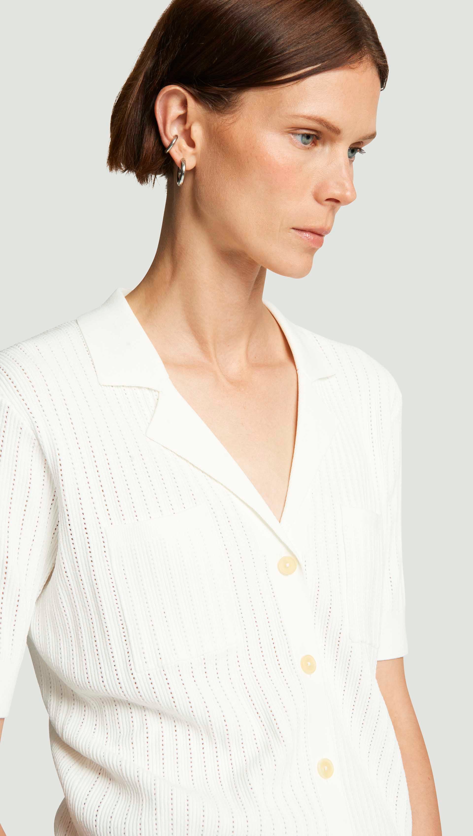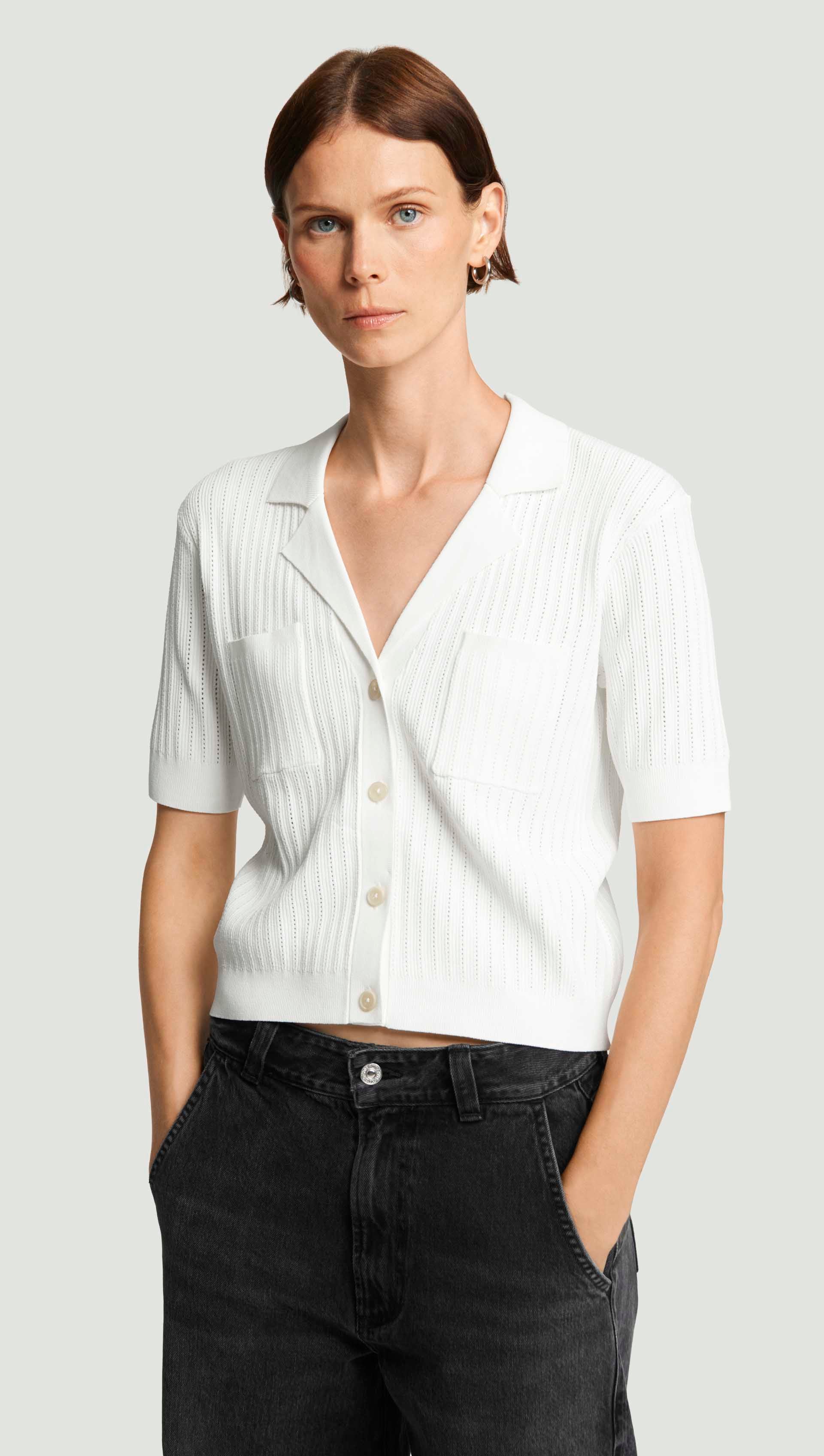 Discover a delightful new knit for your spring and summer wardrobe. Made of breathable, open weave viscose blend, this sweater is so soft and comfortable to the touch, it doesn’t require a tank top underneath. Key features include a front breast pocket on the left side and a button closure at the front.