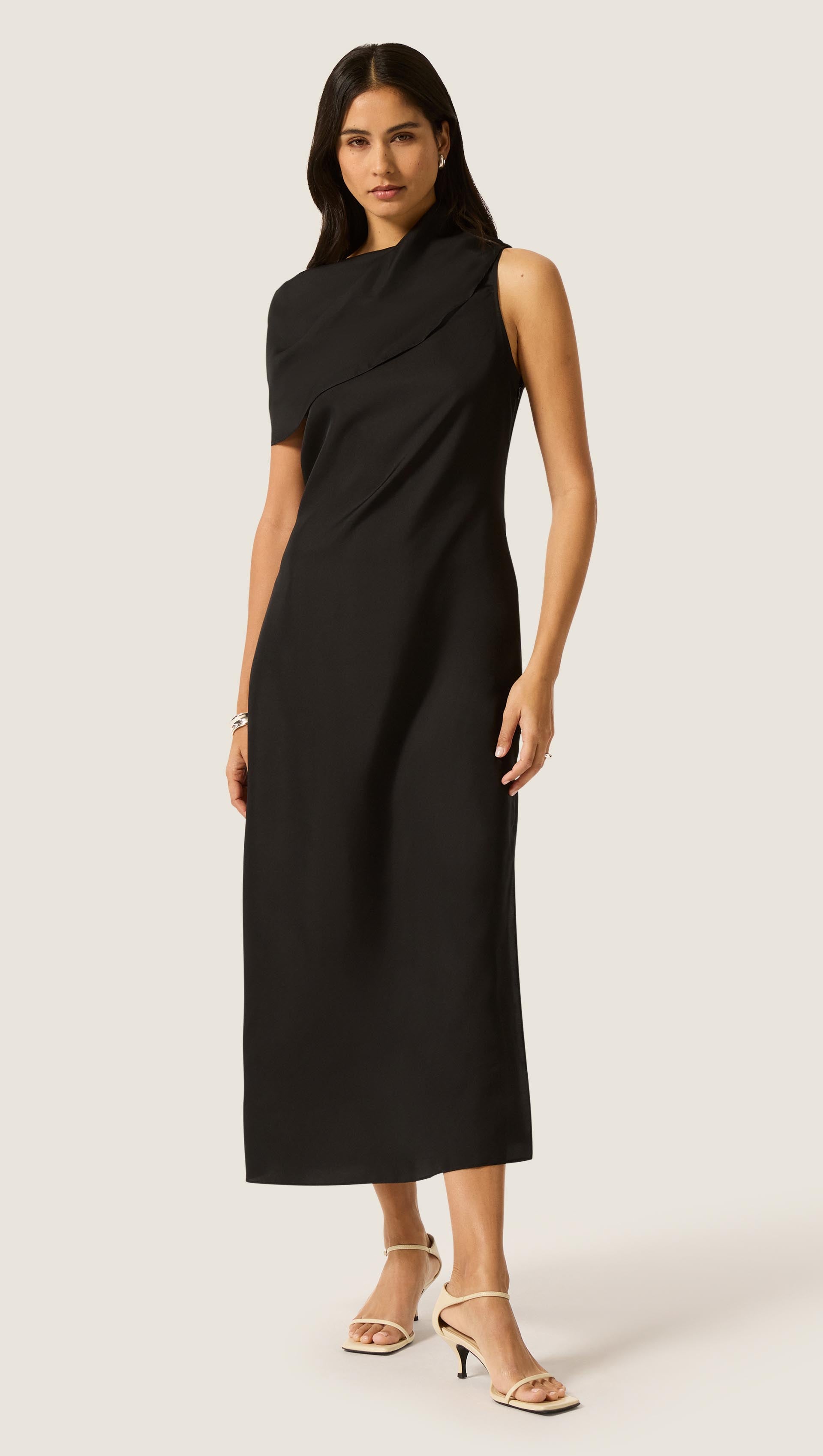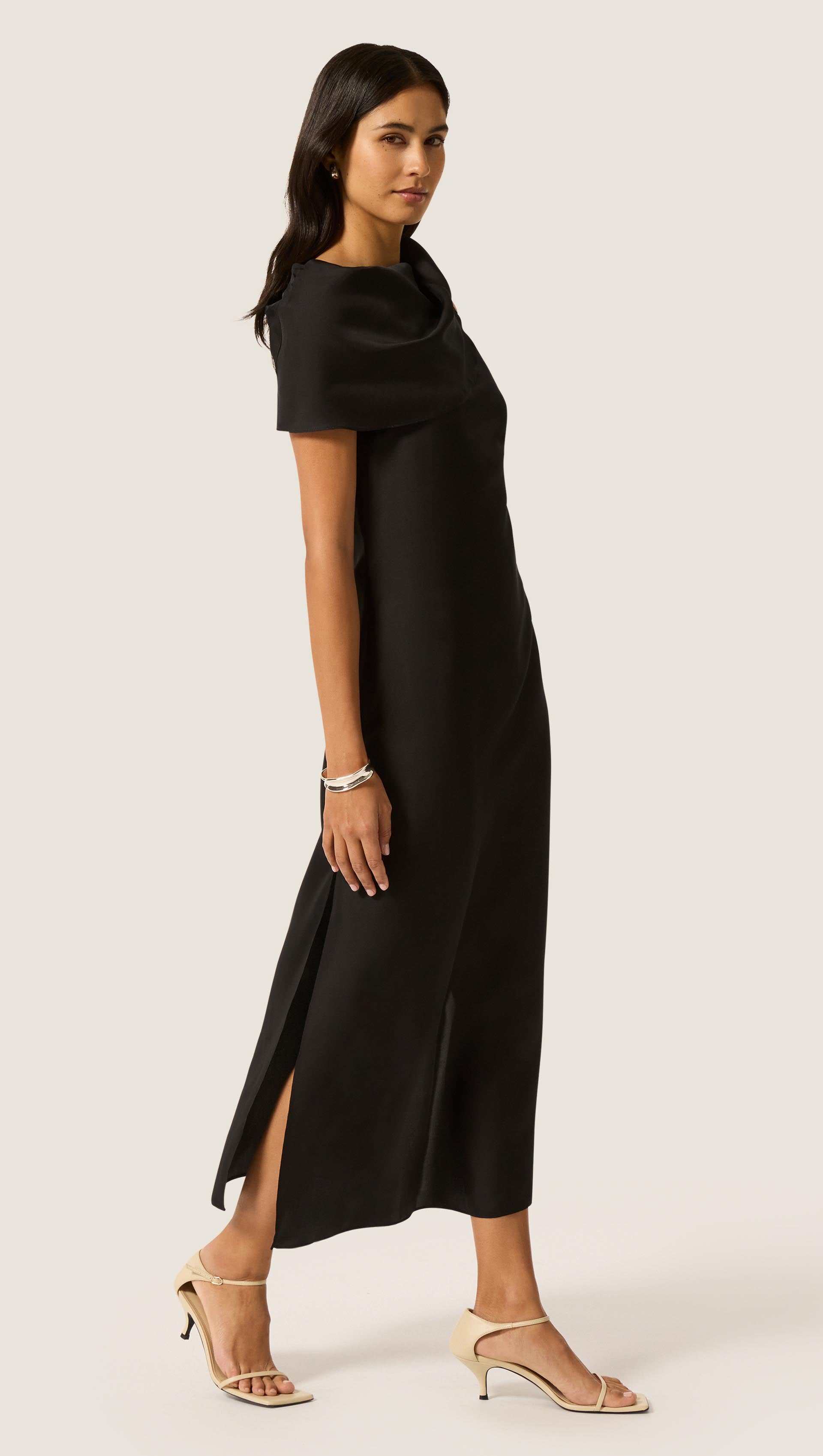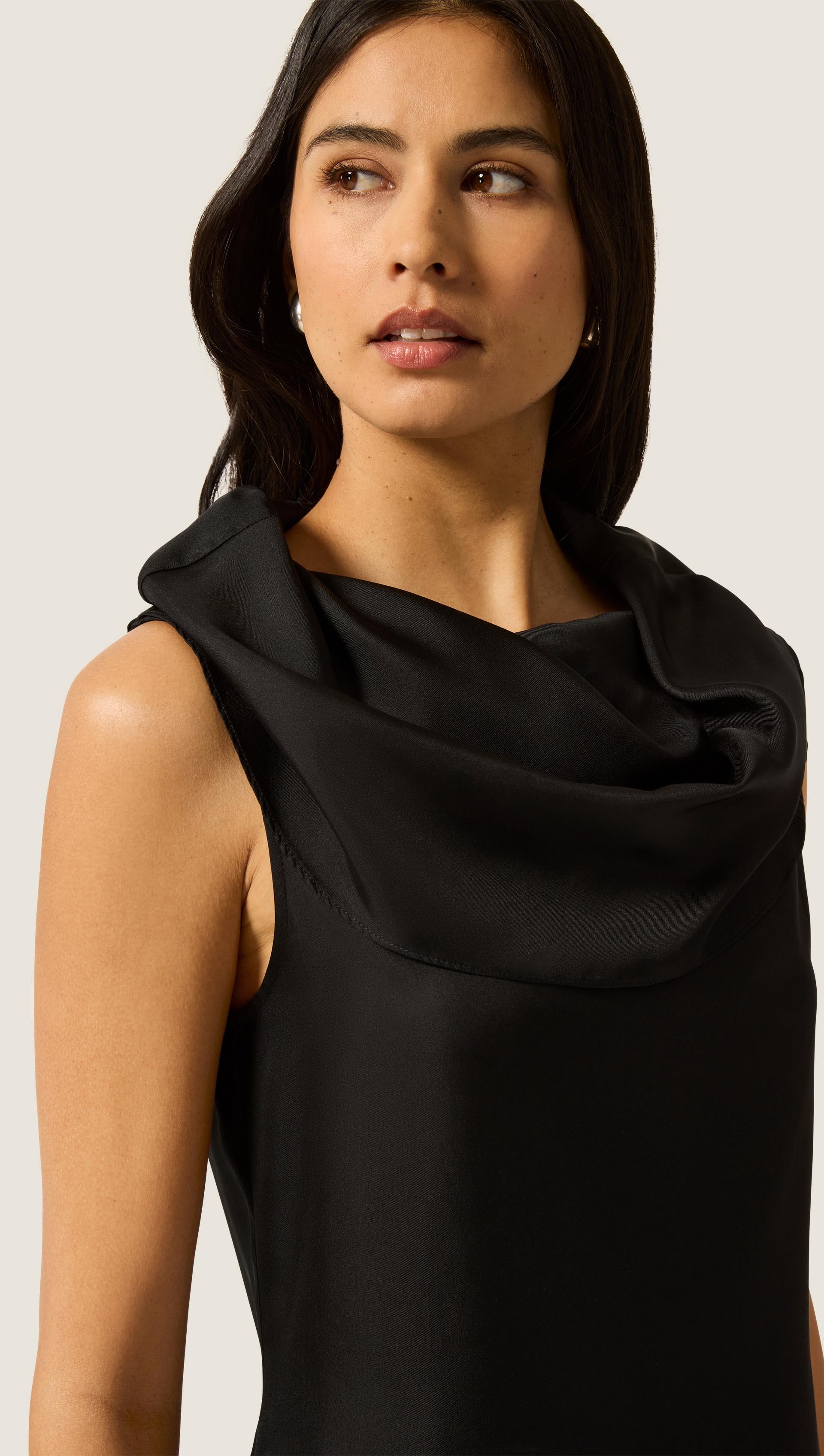 Endless styling potential defines the Funnel Neck Dress. The versatile neckline can be swept elegantly over one shoulder or arm for a dramatic, elongated silhouette, or softly puddled at the front for a relaxed, effortless drape. Fluid, intentional, and endlessly adaptable, it’s a top that invites creativity—no two wears are ever the same.