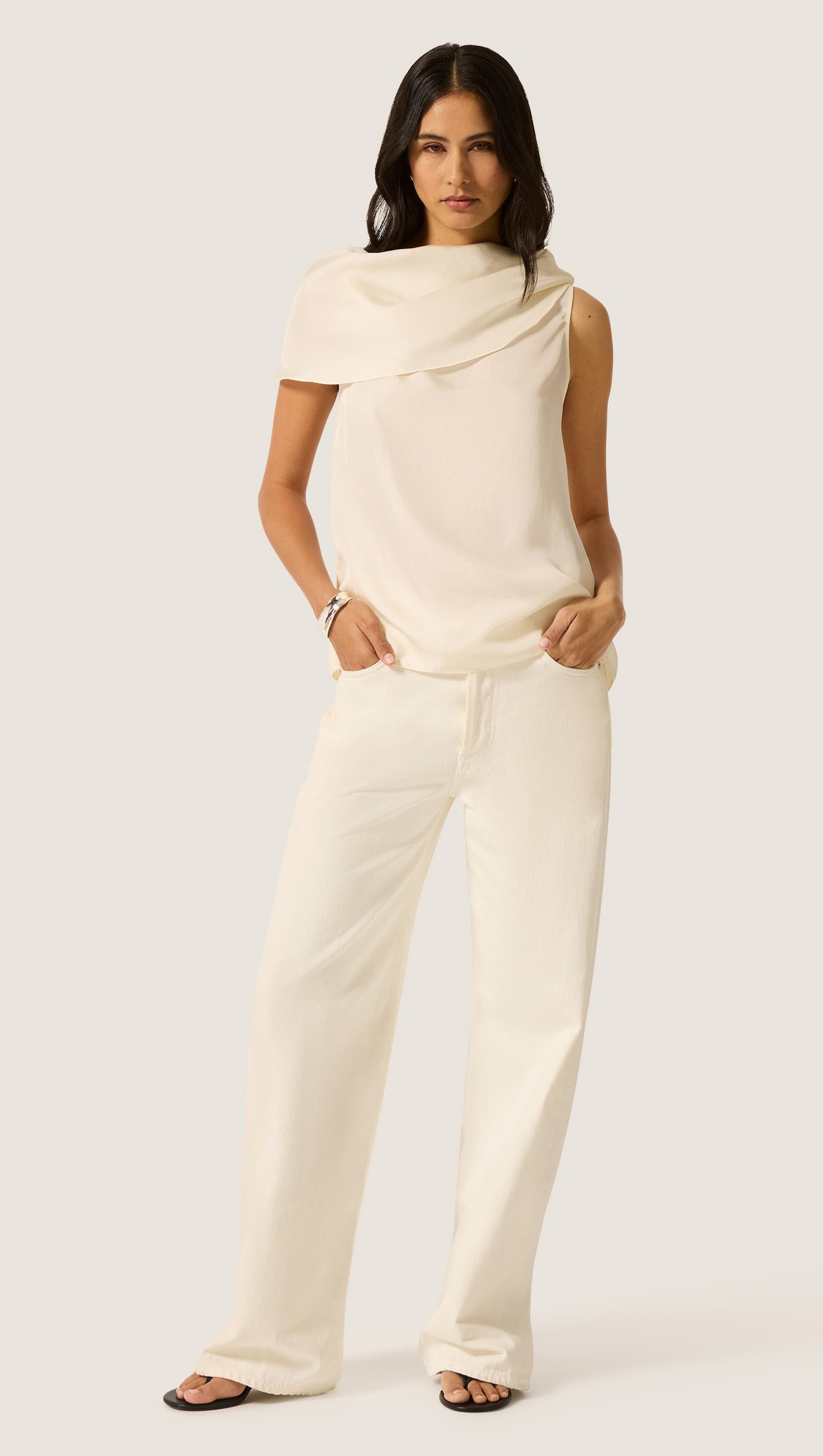 Endless styling potential defines the Funnel Neck Top. The versatile neckline can be swept elegantly over one shoulder or arm for a dramatic, elongated silhouette, or softly puddled at the front for a relaxed, effortless drape. Fluid, intentional, and endlessly adaptable, it’s a top that invites creativity—no two wears are ever the same.