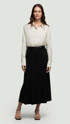 Sleek and elongated, this modern skirt features a double-slit detail and structured stretch crepe for a clean, tailored finish. Polished yet effortless, it pairs well with oversized knits and tailored blouses alike.