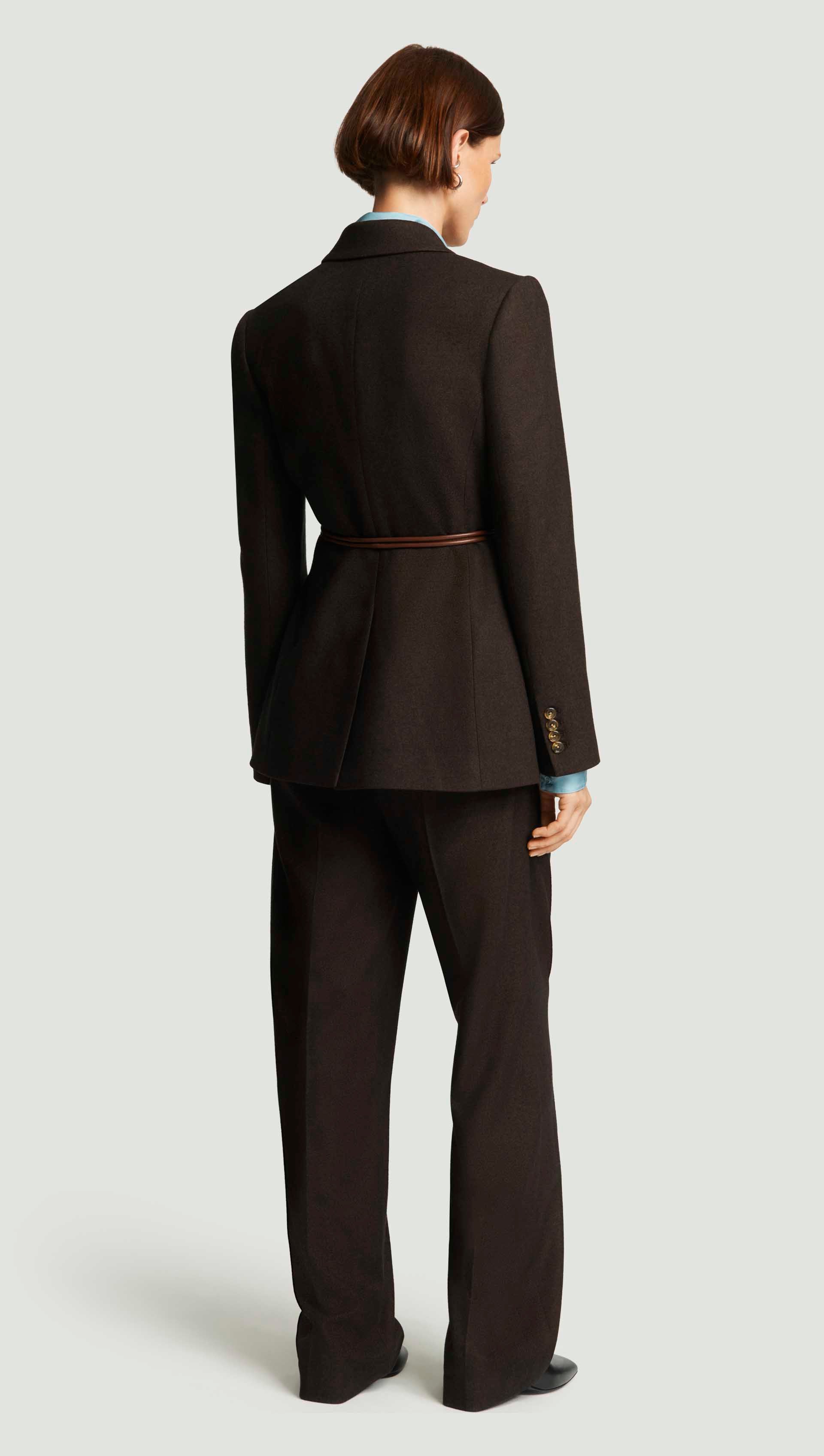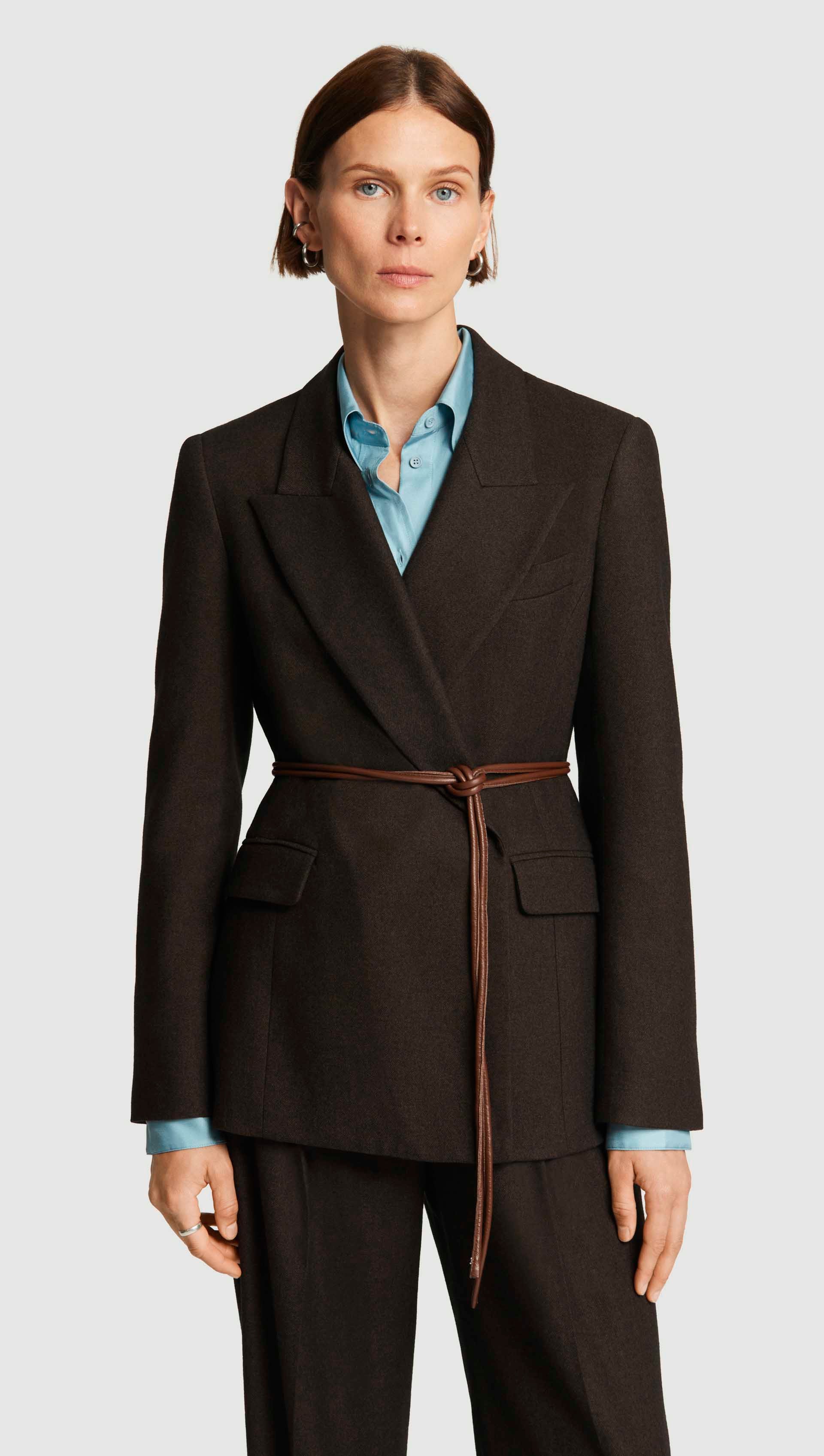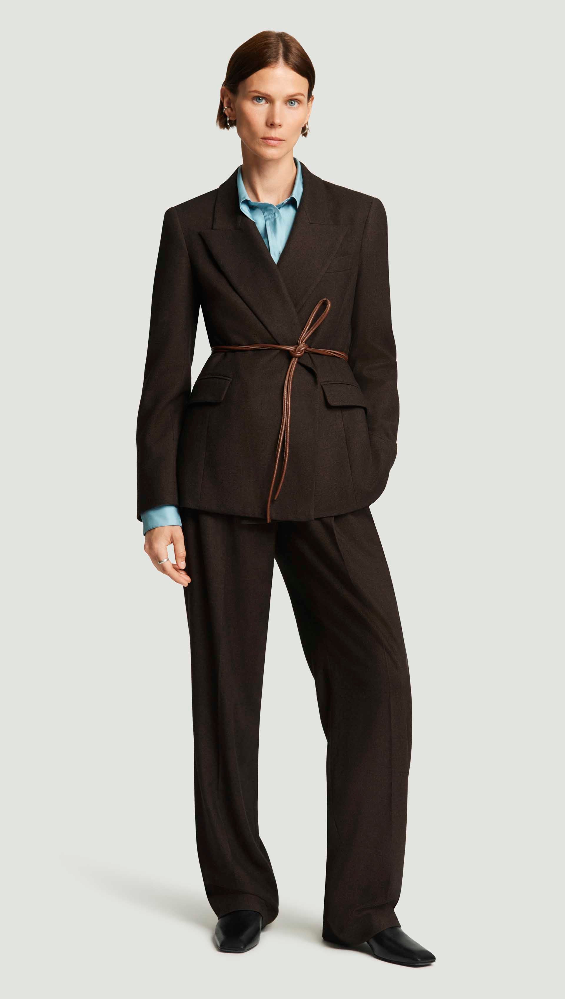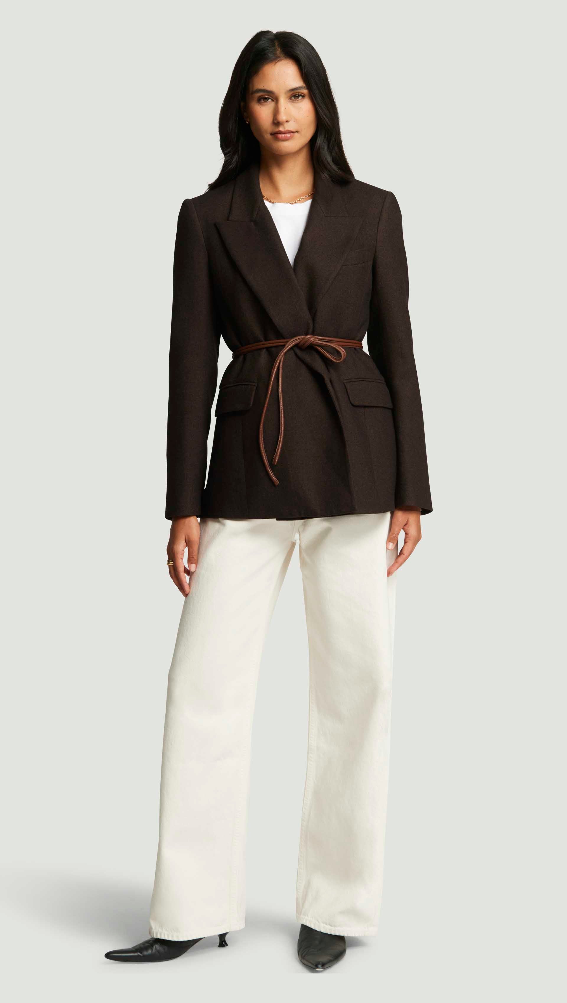 Welcome the Lenox Blazer and its commanding presence. Crafted from a midweight brushed wool, this sturdy silhouette features a removable belt that sculpts the waist. Versatile and bold, this style pairs with sleek denim or tailored trousers for an elevated, fully suited look.