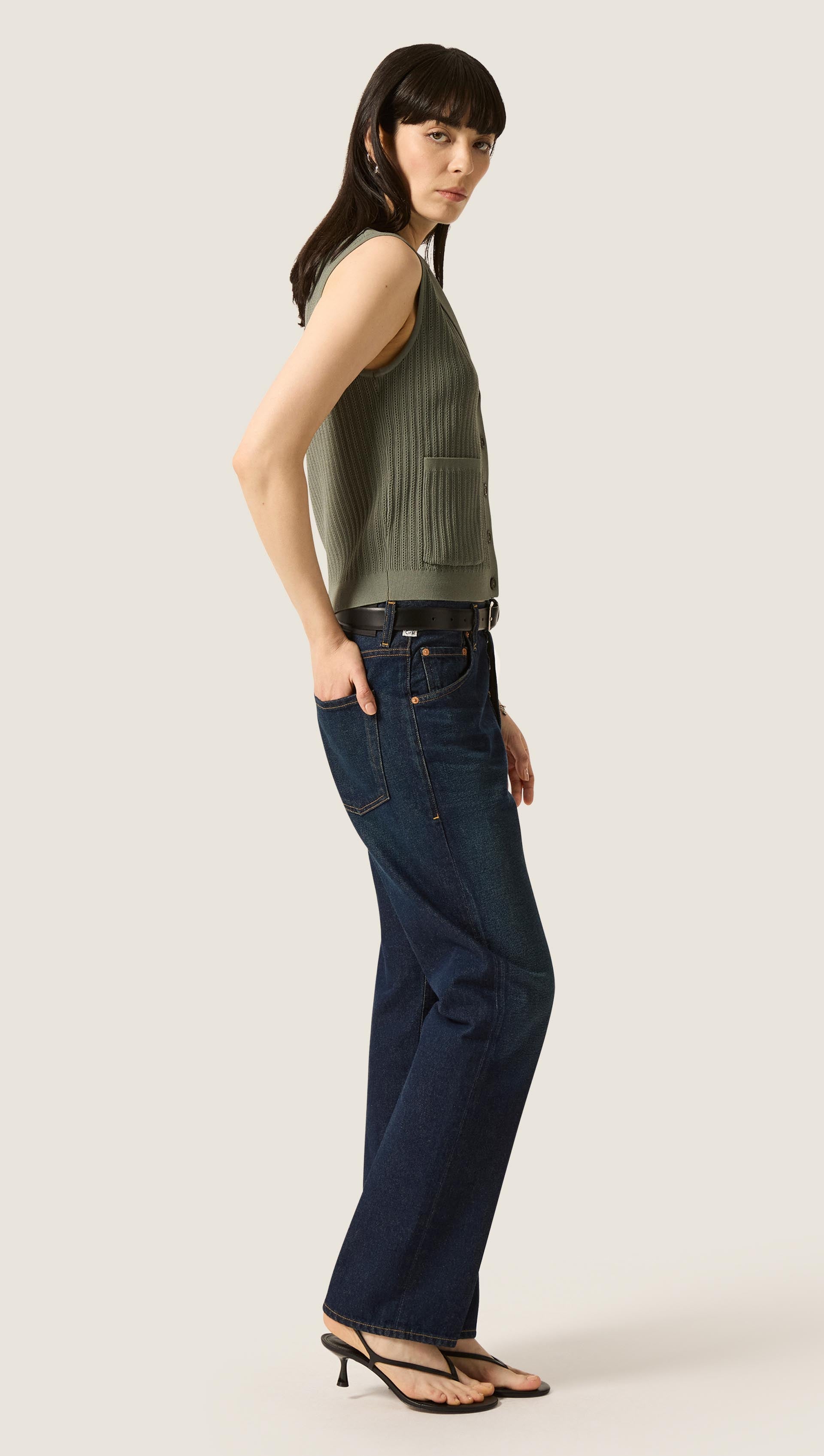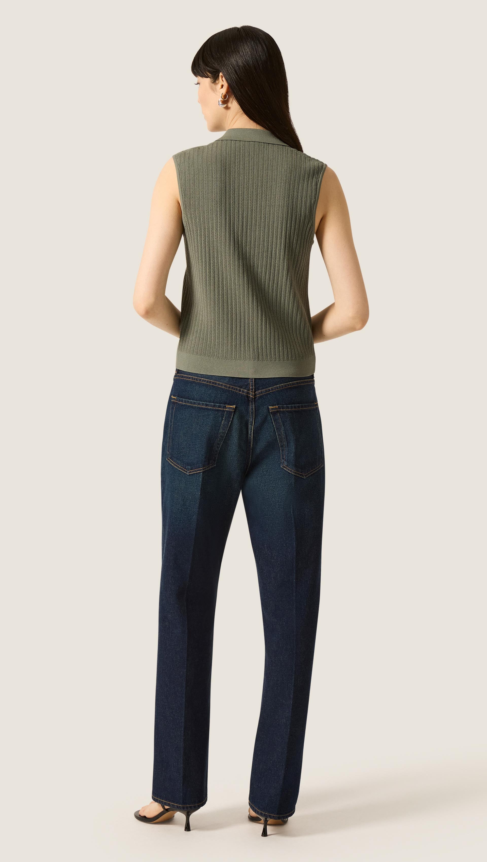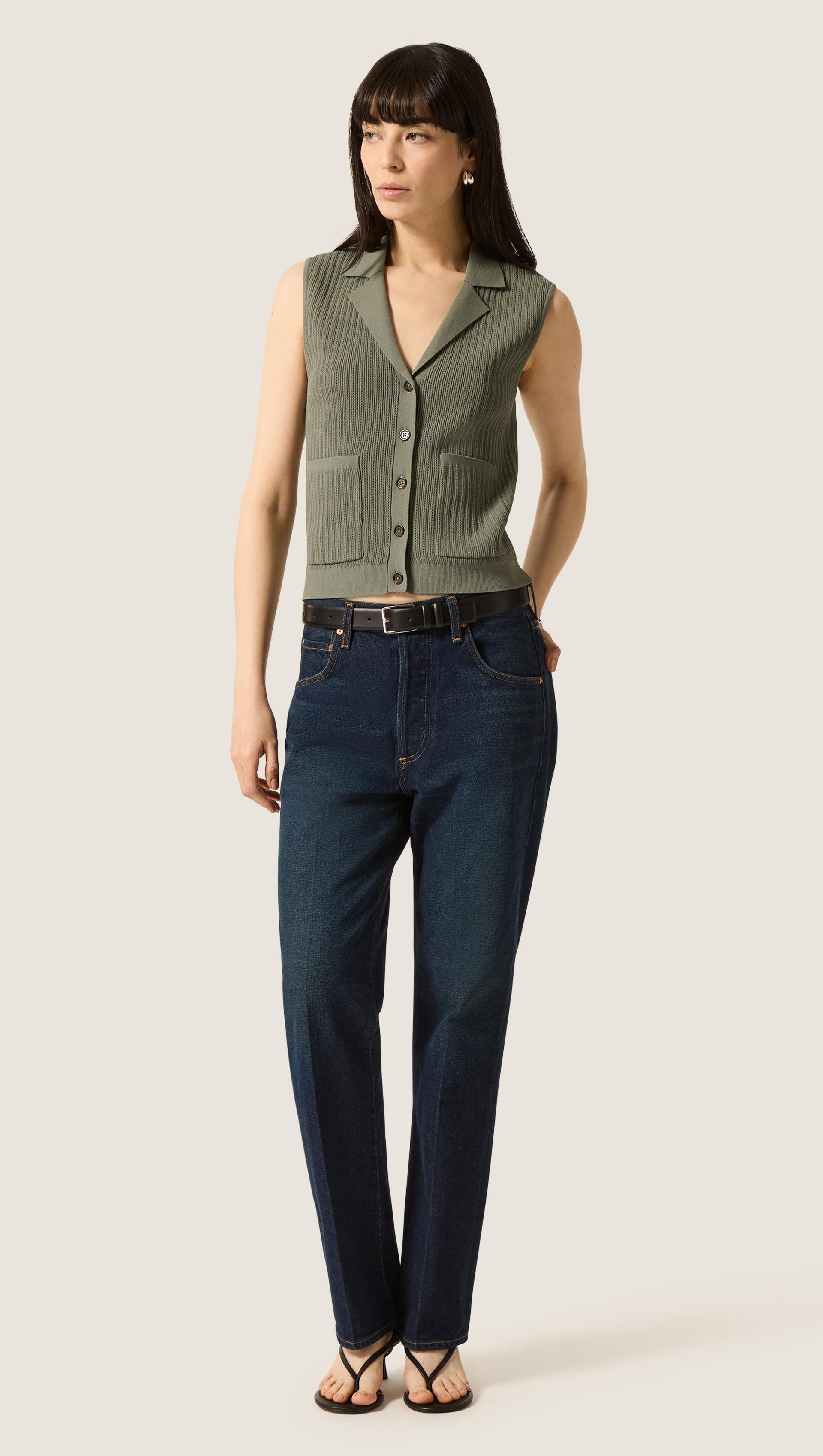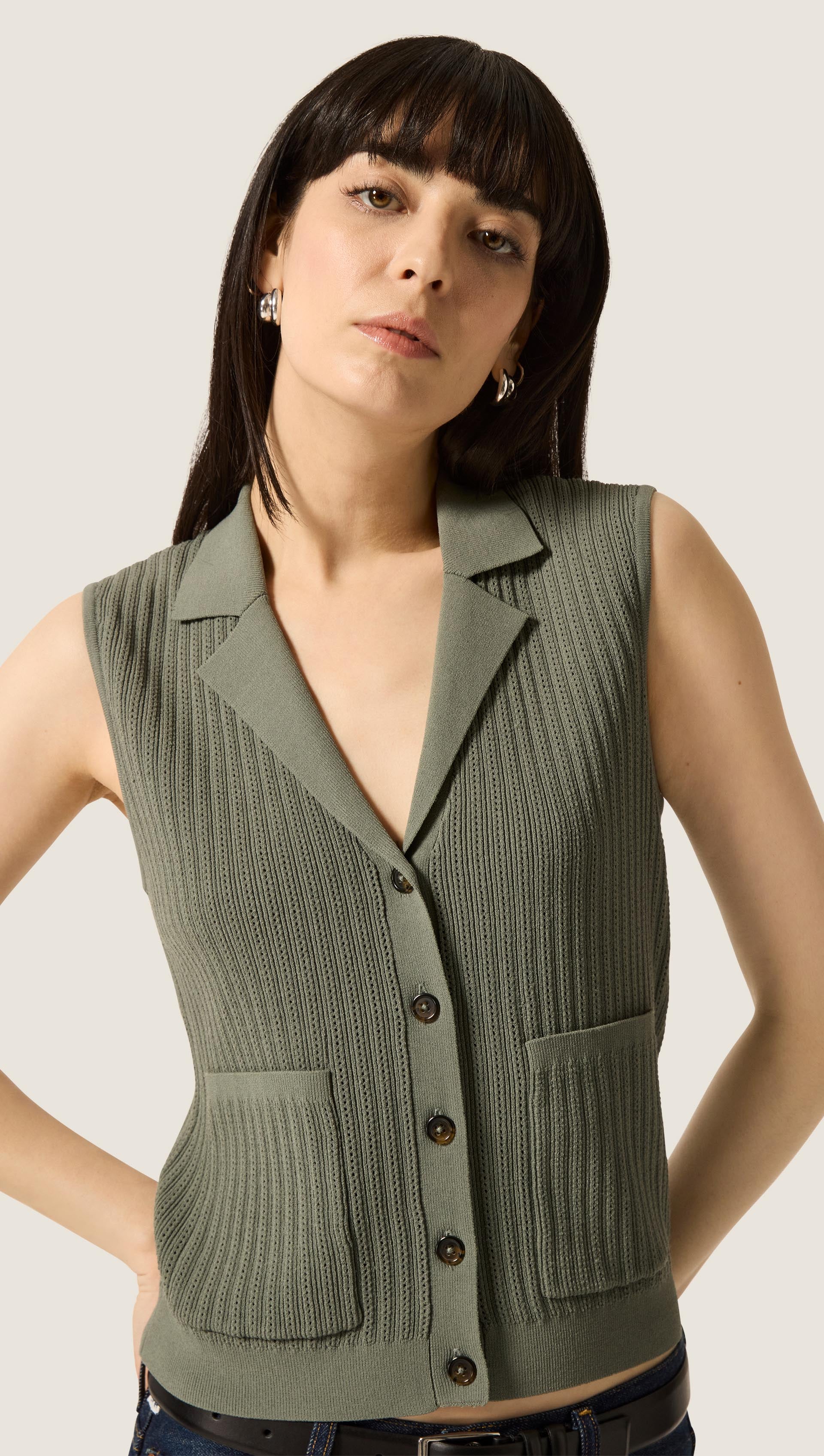 Breathable and effortless, this front-closing sleeveless knit features front knit pockets and a collar for cozy, considered details.